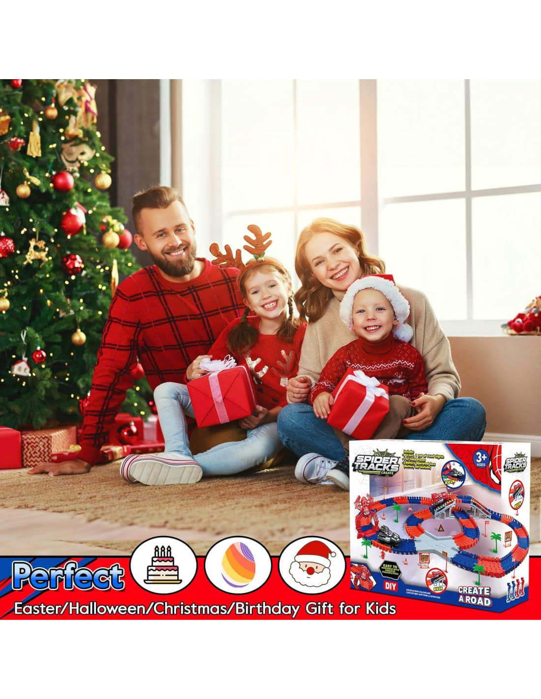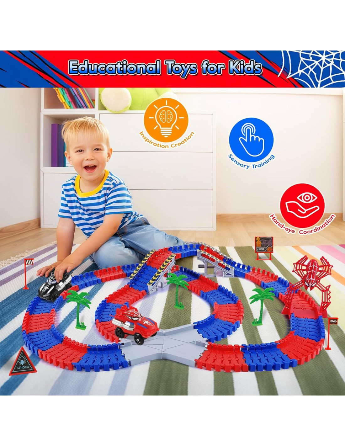 - [Pista de Autos de Carreras de Juguetes de Araña] Nuestra pista de carreras de juguetes de araña incluye 212 piezas de pista, 2 autos de juguete de araña (cada auto de juguete necesita 1 batería AA, no incluida). Crea pistas de tren de araña únicas. Un buen juguete de interacción para niños y niñas.