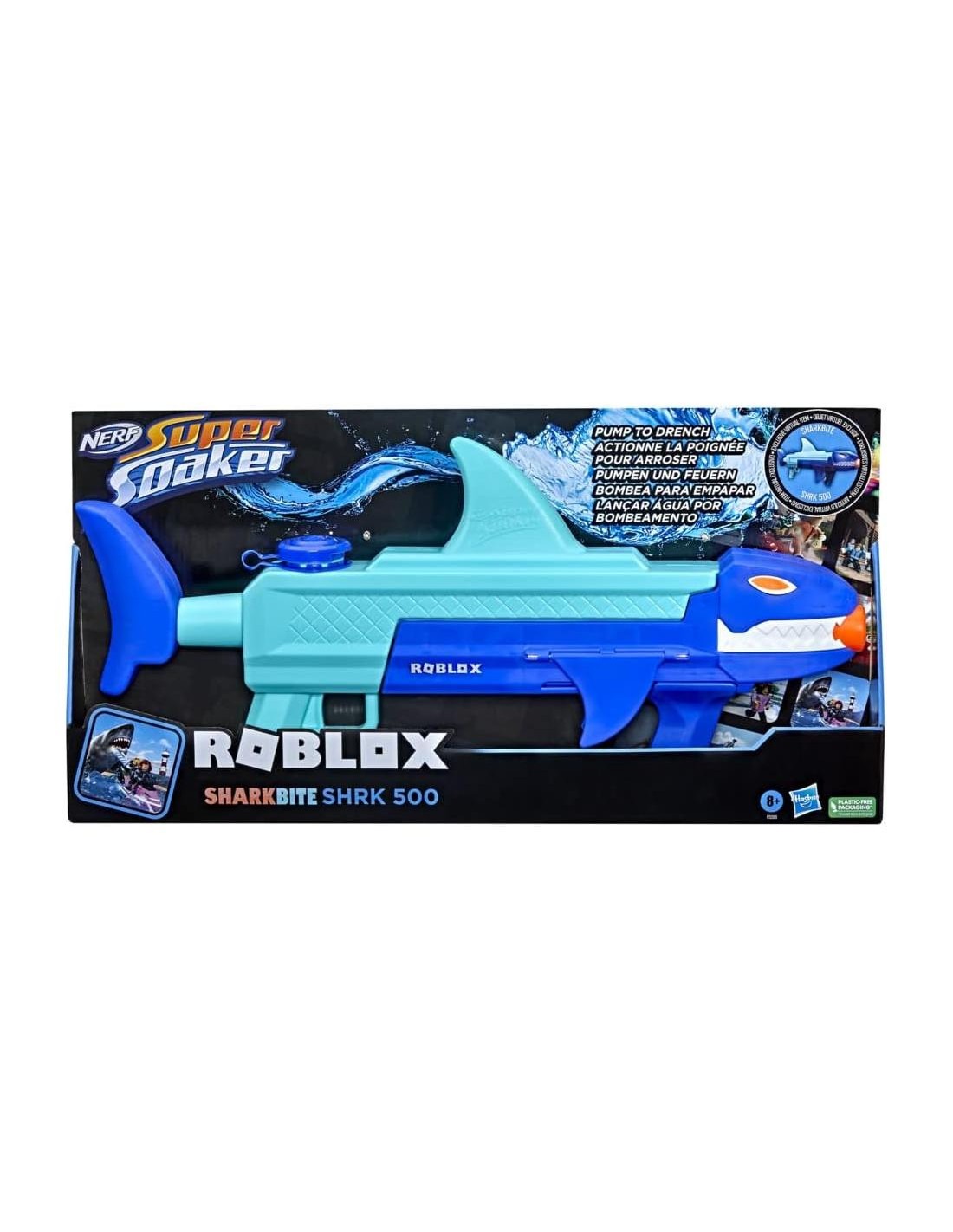 - NERF SUPER SOAKER ROBLOX SHARKBITE: SHRK 500 BLASTER DE AGUA: Este blaster de lanzamiento de agua se inspira en la experiencia de Roblox SharkBite de opplo y Simoon68