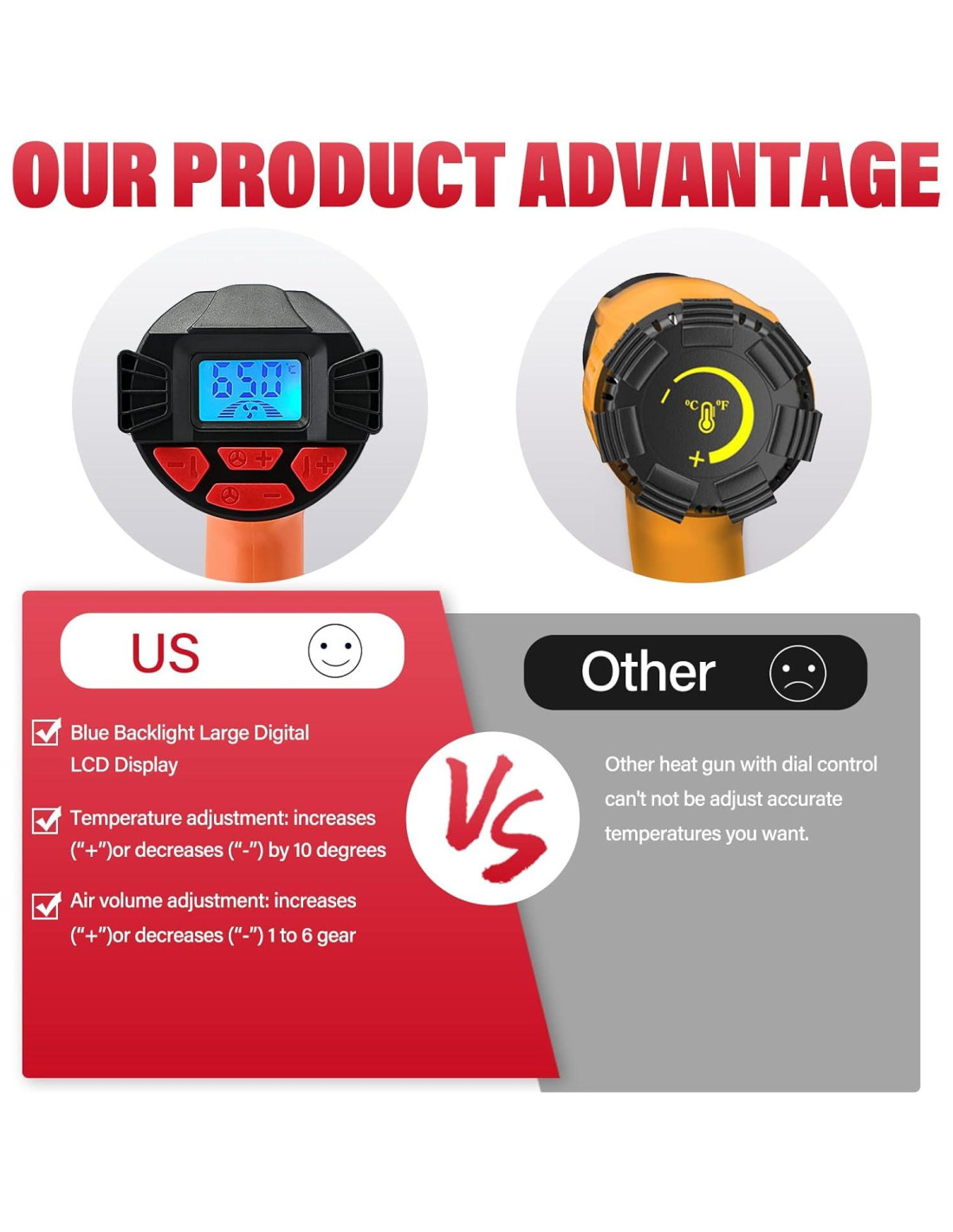 - Pistola de Calor de 2000W y Ajuste de Botón: La Pistola de Calor de 2000W proporciona más potencia rápidamente que otras que alcanzan hasta 1202F(650C) en segundos. Ajuste de temperatura: 50C(122F)-650C(1202F), aumenta ("+") o disminuye ("-") en 10 grados. Ajuste del volumen de aire: de 1 a 6 niveles. Otros modelos básicos solo pueden usar dos niveles de temperatura para controlar la temperatura, sin ajuste de botón y función de pantalla LCD.