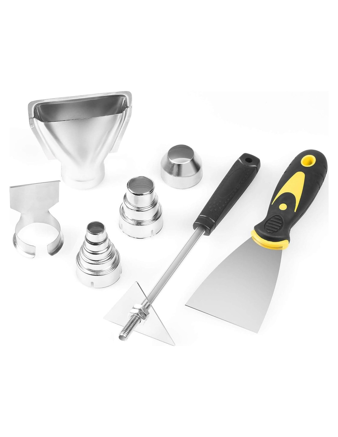 - Accesorios Versátiles. 5 Boquillas, raspador de pintura y espátula extienden la utilidad de la pistola de calor. Una variedad de boquillas y raspadores realiza aplicaciones amplias y flexibles.