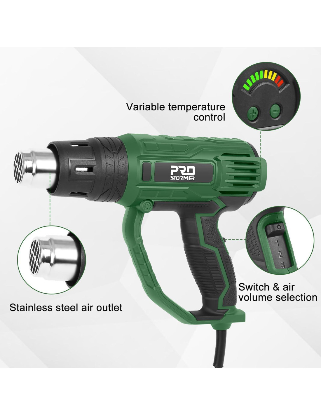 La fábrica OEM de Prostormer fue fundada en 1993. Siempre nos enfocamos en mejorar la calidad del producto. El equipo técnico profesional también aporta innovación e ideas creativas para cada producto. Creemos en el poder de las herramientas, mejores herramientas, mejor vida. Nuestros productos pueden cubrir la gran mayoría de su trabajo diario - siempre ahí en momentos críticos. Creemos que las herramientas Prostormer pueden ser su compañero de vida de confianza y un fuerte socio de trabajo. Bomba Sumergible de Agua Limpia/Sucia de 1HP 3700GPH con Interruptor de Flotador Automático. Bomba de Agua de Jardín Sumergible Prostormer. Soldador Multifuncional 3 en 1 con Pantalla Digital. Sierra de Mesa Multifuncional de 10 Pulgadas 15A con Soporte Ángulo de Cuchilla 45 -90. Mesa de Trabajo de Garaje Multifuncional con Kit de Ganchos para Tablero de Clavos para Hogar, Garaje y Proyectos de Hágalo Usted Mismo. Caballete Portátil de Alta Resistencia con Capacidad de Peso de 2601 lbs (1180 kg) por Par. Esta pistola de calor cuenta con tres modos, ideal para manualidades, proyectos de Hágalo Usted Mismo, desprendimiento de pintura, trabajo con PVC y envoltura de retracción, esta pistola de aire caliente de grado profesional combina un rendimiento rápido con una adaptabilidad inigualable tanto para aficionados como para profesionales. Con un diseño de turbina que aumenta la presión de salida de aire durante la rotación, esta pistola de calor ofrece un fuerte y potente flujo de aire para un rendimiento máximo.