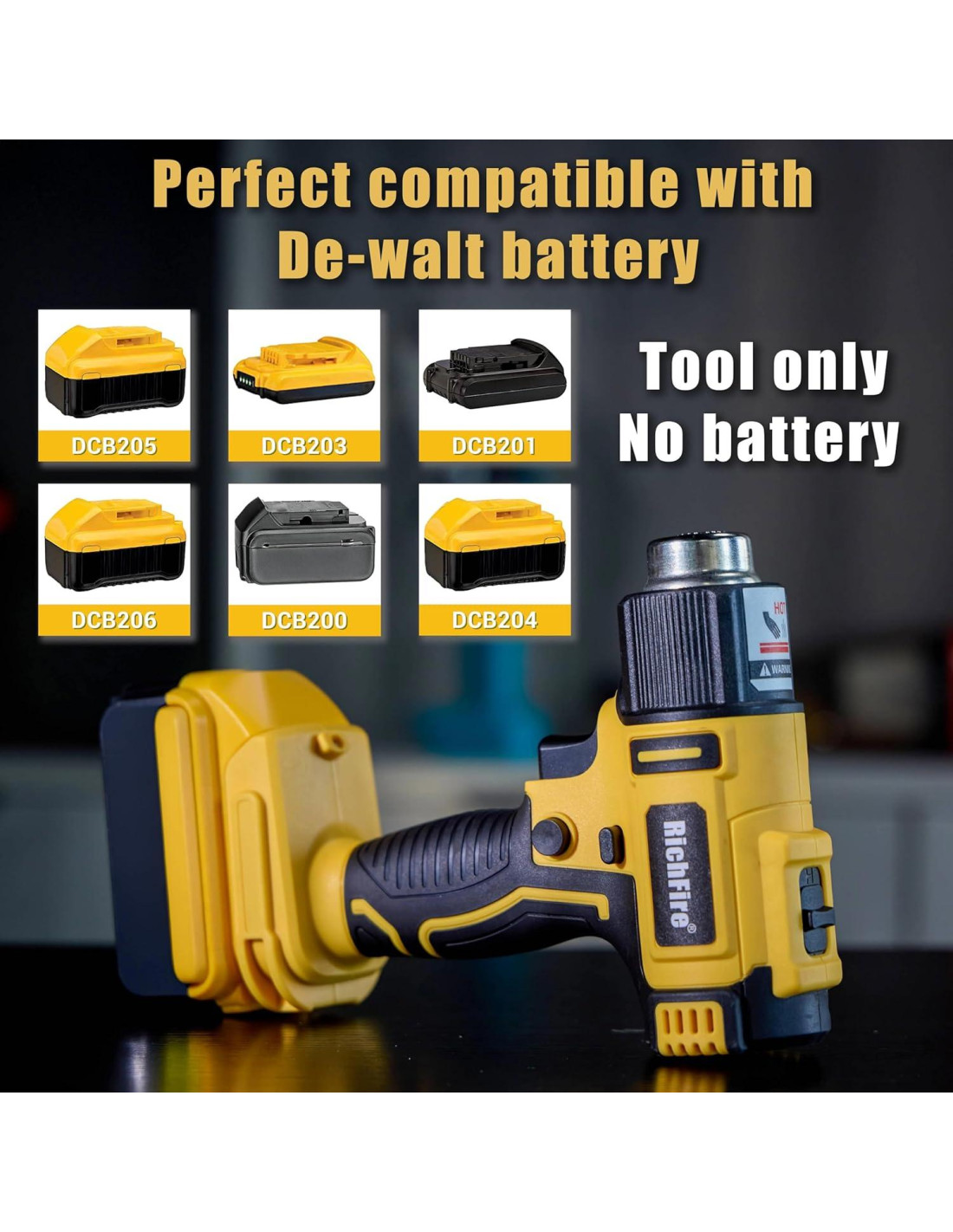 - Compatible con Batería DEWALT: Esta pistola de calor inalámbrica es perfectamente compatible con la batería DEWALT. Su fuerte duración de batería asegura que la pistola de aire caliente pueda emitir continuamente y de manera estable un flujo de aire caliente de alta temperatura, ya sea en trabajos de bricolaje en casa o en mantenimiento profesional, puede manejarlo fácilmente, sin necesidad de reemplazo frecuente de batería o interrupción de las operaciones.