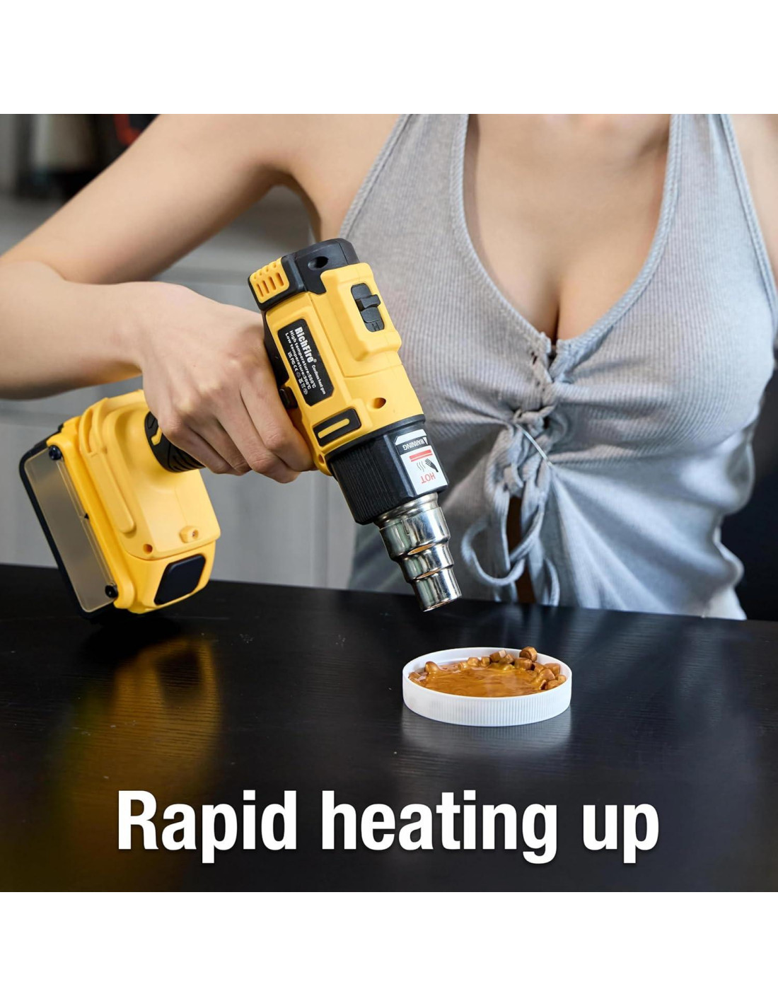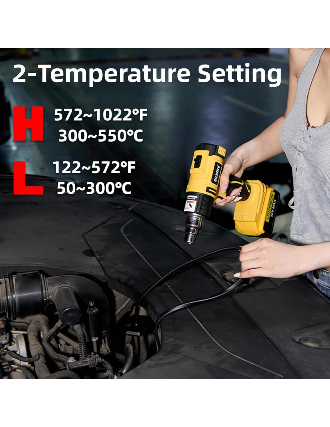 - Calentamiento Eficiente: La pistola de aire caliente inalámbrica está equipada con un avanzado sistema de control de temperatura inteligente y un calentador de 350W para asegurar una salida de aire caliente estable y segura, evitando efectivamente el problema de sobrecalentamiento o temperatura insuficiente. Los rangos de temperatura son de 572F (300C) a 1022F (550C).