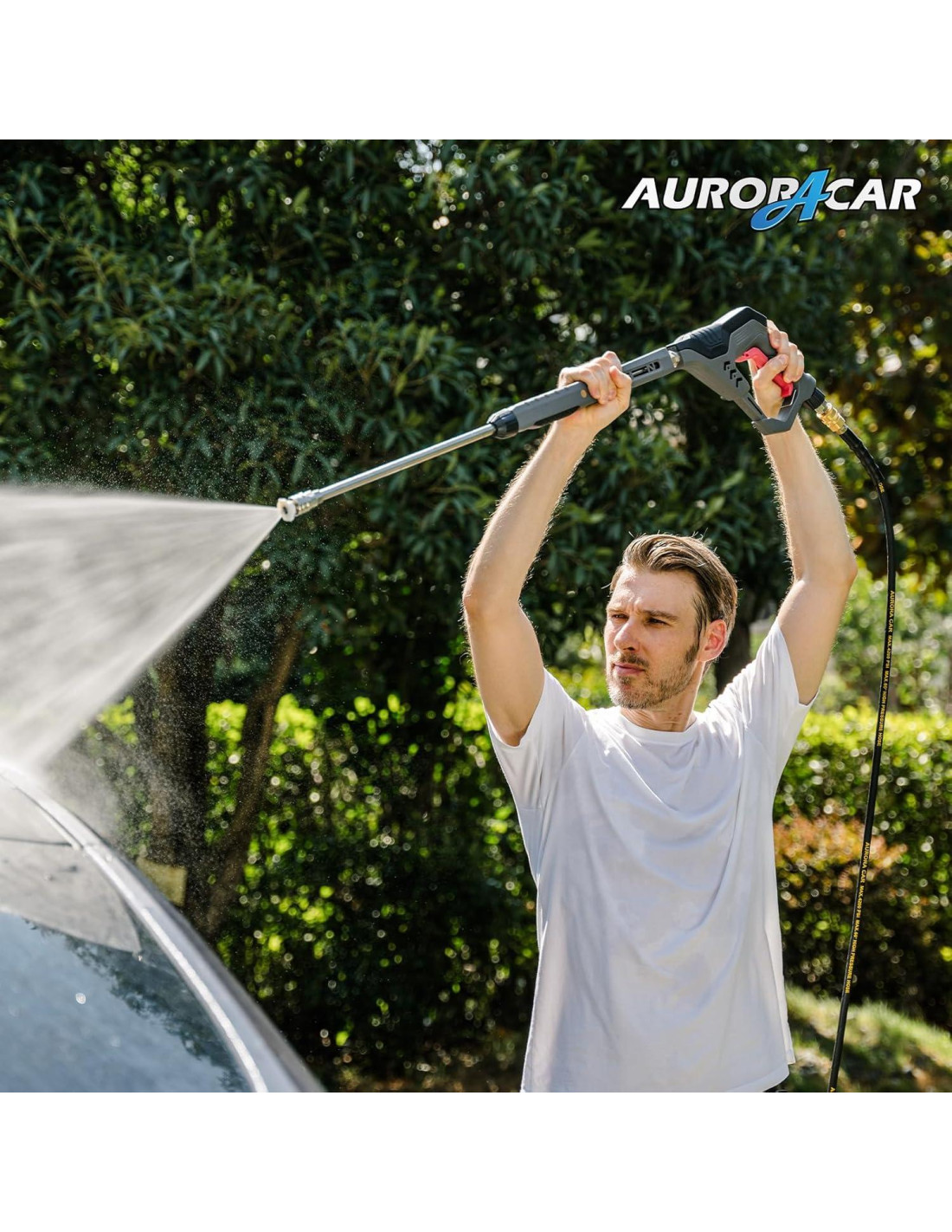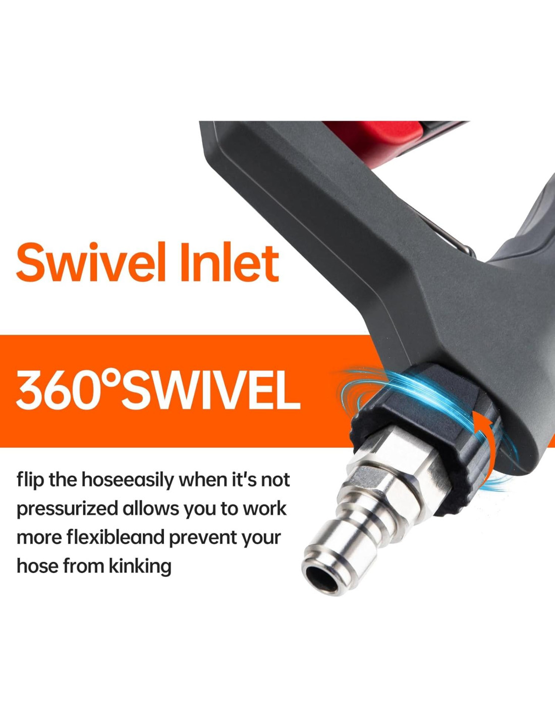 - Giro de 360: La cola de la pistola de lavado a presión tiene un diseño único de rotación libre de 360, por lo que puede girar de manera flexible, lo que evita efectivamente el problema de enredos de mangueras y facilita tu trabajo de limpieza.
