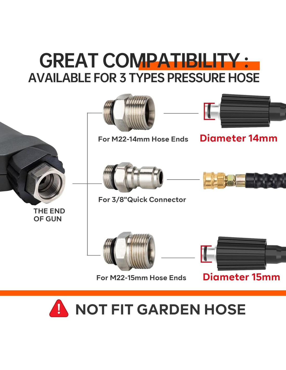 - Especificación: Enchufe de Conexión Rápida de 3/8" (9.53mm) y Conexiones M22-14/M22-15mm, para adaptarse a mangueras de lavado a presión de 3/8" (9.53mm) o M22-14mm/M22-15mm. 5 Puntas de Boquilla con Soporte de Boquilla, elige una boquilla diferente según tus necesidades. Es adecuada para limpiar autos, piscinas, ventanas, techos, aceras, etc.