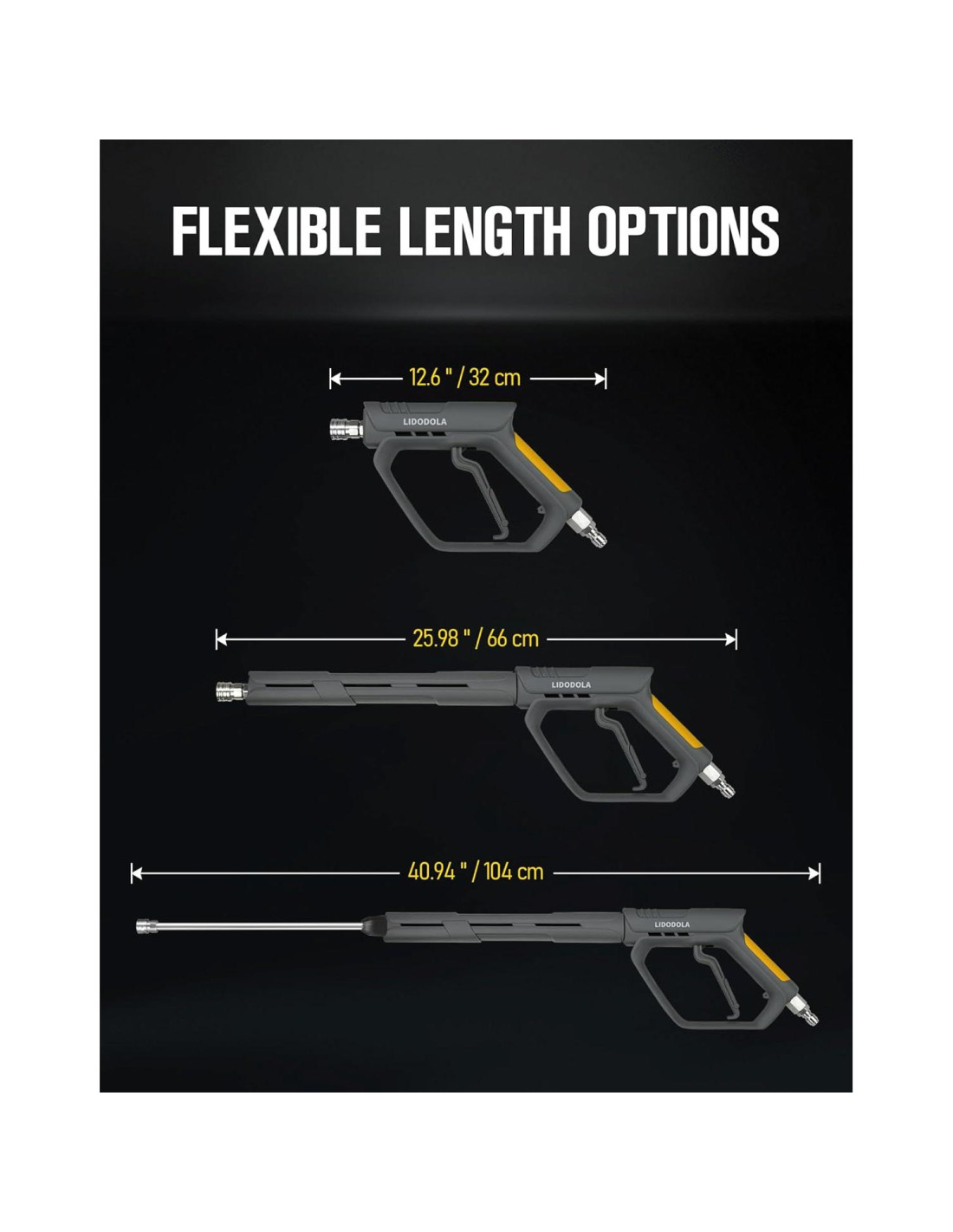 - PISTOLA DE LAVADO A PRESIÓN PROFESIONAL - La Pistola de Lavado a Presión Lidodola es la actualización perfecta para su lavadora a presión. Deje de usar esas pistolas de spray con fugas y mal compatibles que vienen con su lavadora a presión, y actualice a una pistola de calidad. La pistola de limpieza de alta presión de longitud ajustable reduce el reposicionamiento, mejora la accesibilidad y aumenta la seguridad.