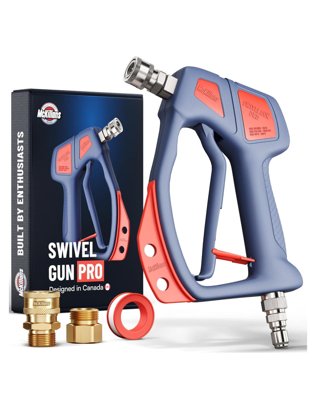 ¿Qué adaptadores están incluidos? Incluimos dos adaptadores. El primero convierte un conector de manguera estándar M22-14mm a un conector rápido hembra de 3/8". El segundo es un adaptador M22-15mm que convierte el primer adaptador a 15mm. ¿Qué pasa si gotea? La pistola es completamente reconstruible e incluimos juntas tóricas y cinta de teflón adicionales para arreglar rápidamente cualquier fuga en el futuro. ¿Cuál es la presión máxima y la tasa de flujo? Máx 4000 PSI y 7GPM. La mayoría de las especificaciones de las lavadoras a presión son inexactas en la caja. Verifica las especificaciones del mundo real usando un manómetro de PSI. ¿Se requiere una lavadora a presión? Sí, la Swivel Gun Pro requiere una lavadora a presión. No se recomienda intentar conectarla directamente a una manguera de jardín. ¿Qué hay de nuevo en esta pistola? - Soporte de Punta Integrado - Gatillo más cómodo - Agarre más cómodo y plásticos texturizados - Muesca para fácil acceso al conector rápido - Giratorio empotrado con mejor fluidez Swivel Gun Pro Pro Foam Cannon Kit Pro Extension Wand Kit Pro Wall Organizer Kit Pro Deluxe Kit Pro Ultimate Kit McKillans Pro Full Kit