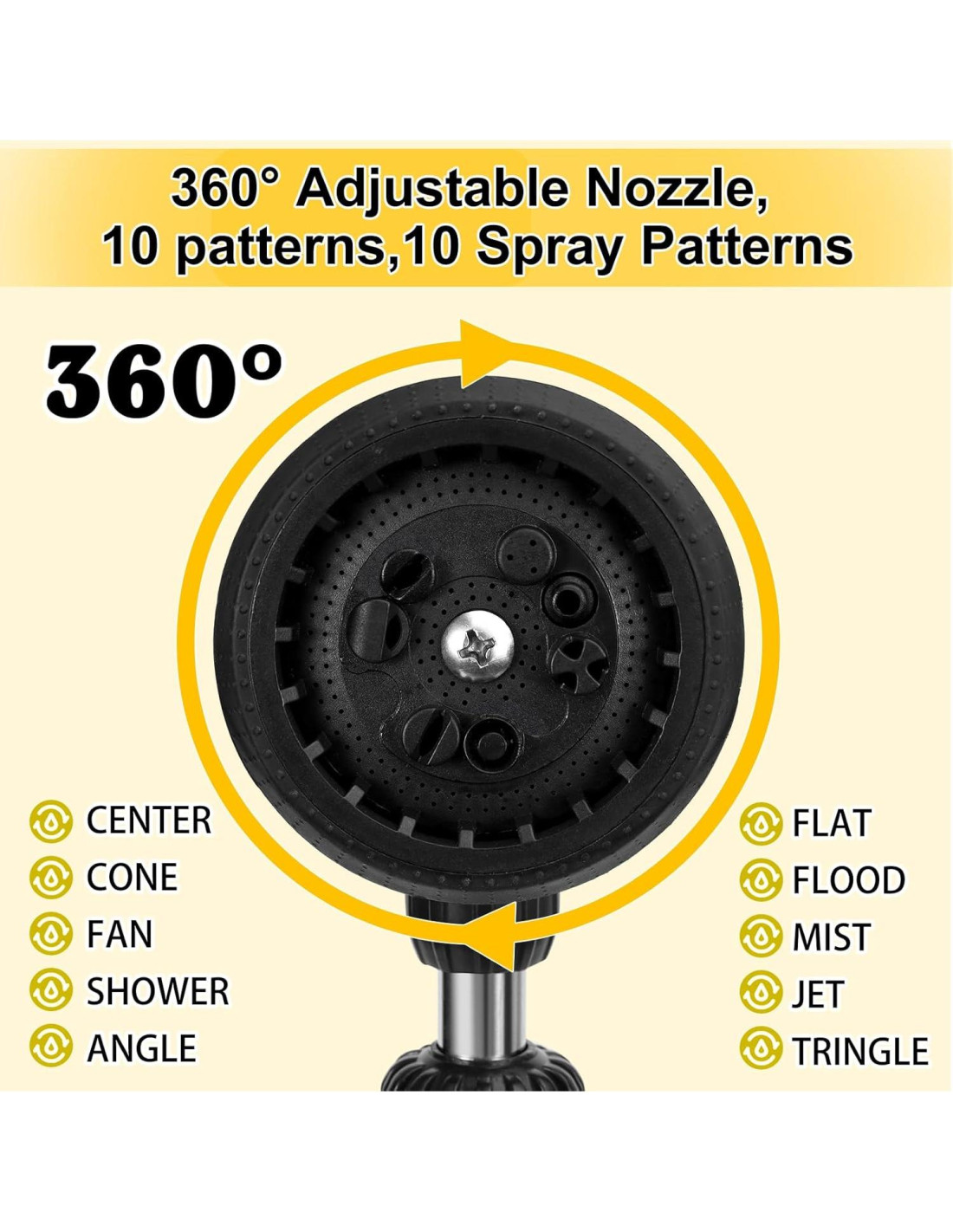 - Control del flujo de agua: La perilla de control del flujo de agua en el mango puede ajustar la presión de riego para cada uno de los 10 patrones de rociado, lo que puede ampliar sus opciones al regar su césped, plantas, etc.