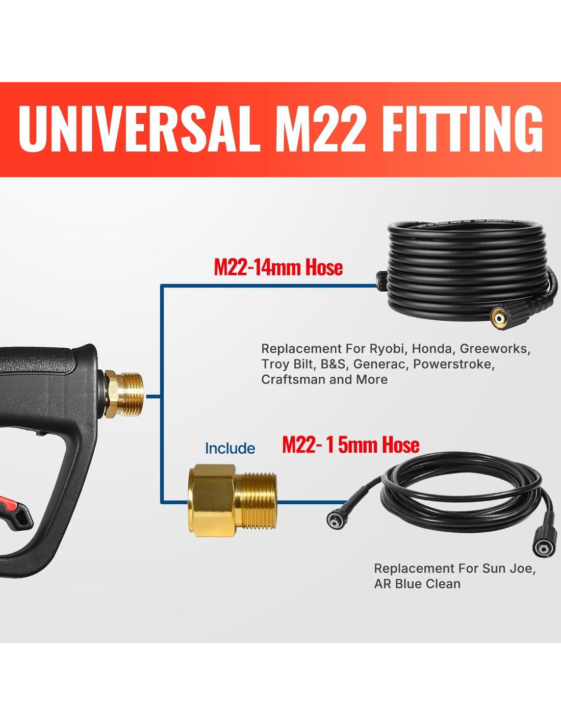 - [Adaptabilidad M22] Este mango de lavadora a presión viene con entrada macho M22-14mm y M22-15mm, que se adapta a la mayoría de las mangueras de lavadora a presión con rosca M22. La salida de conector rápido universal de 1/4" es compatible con cañones de espuma de alta presión, boquillas de pulverización, varas de extensión y más accesorios para mejorar su eficiencia laboral.