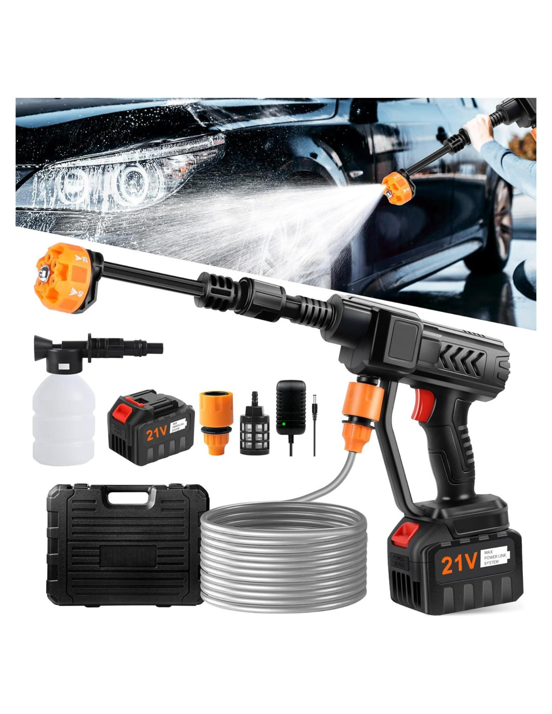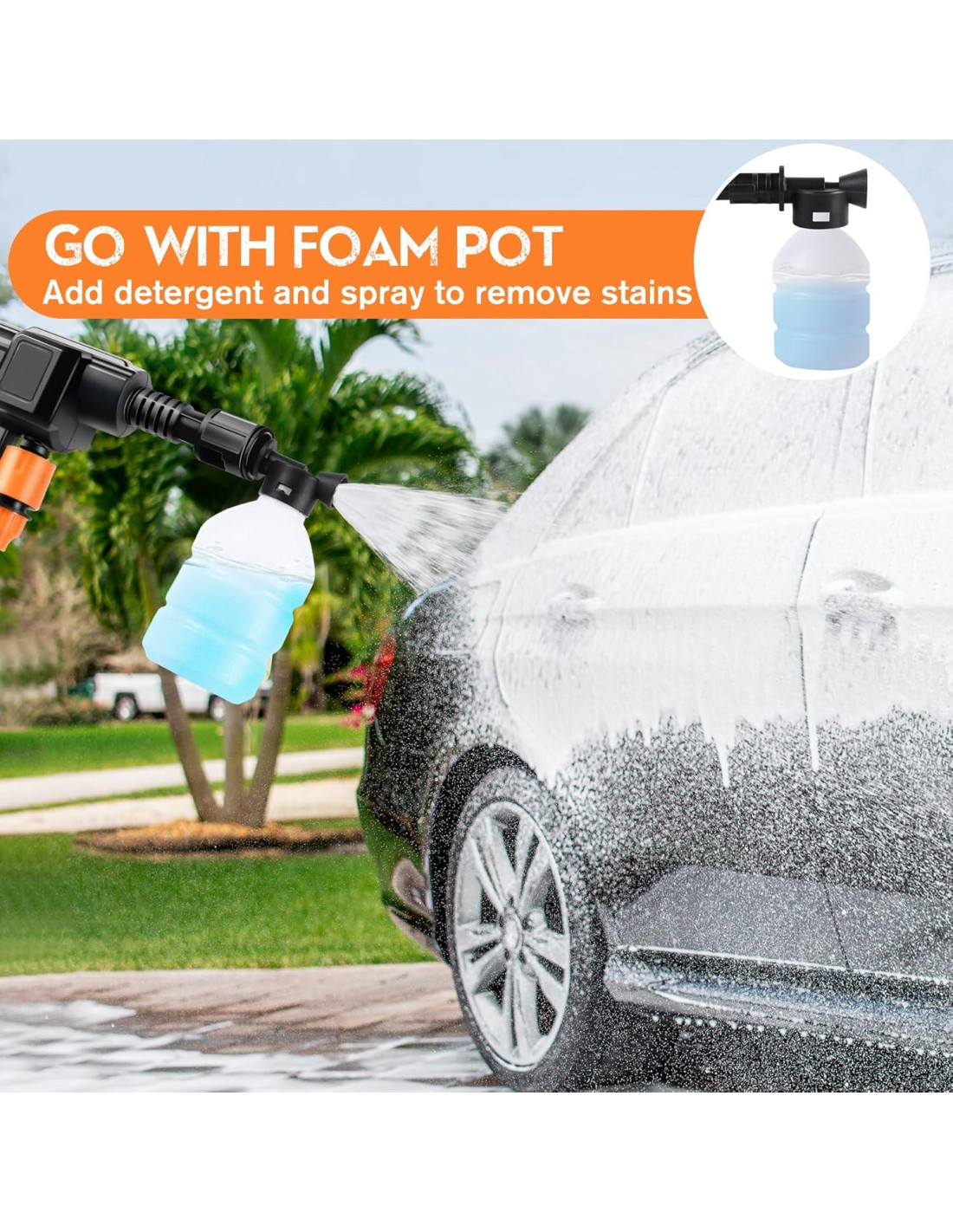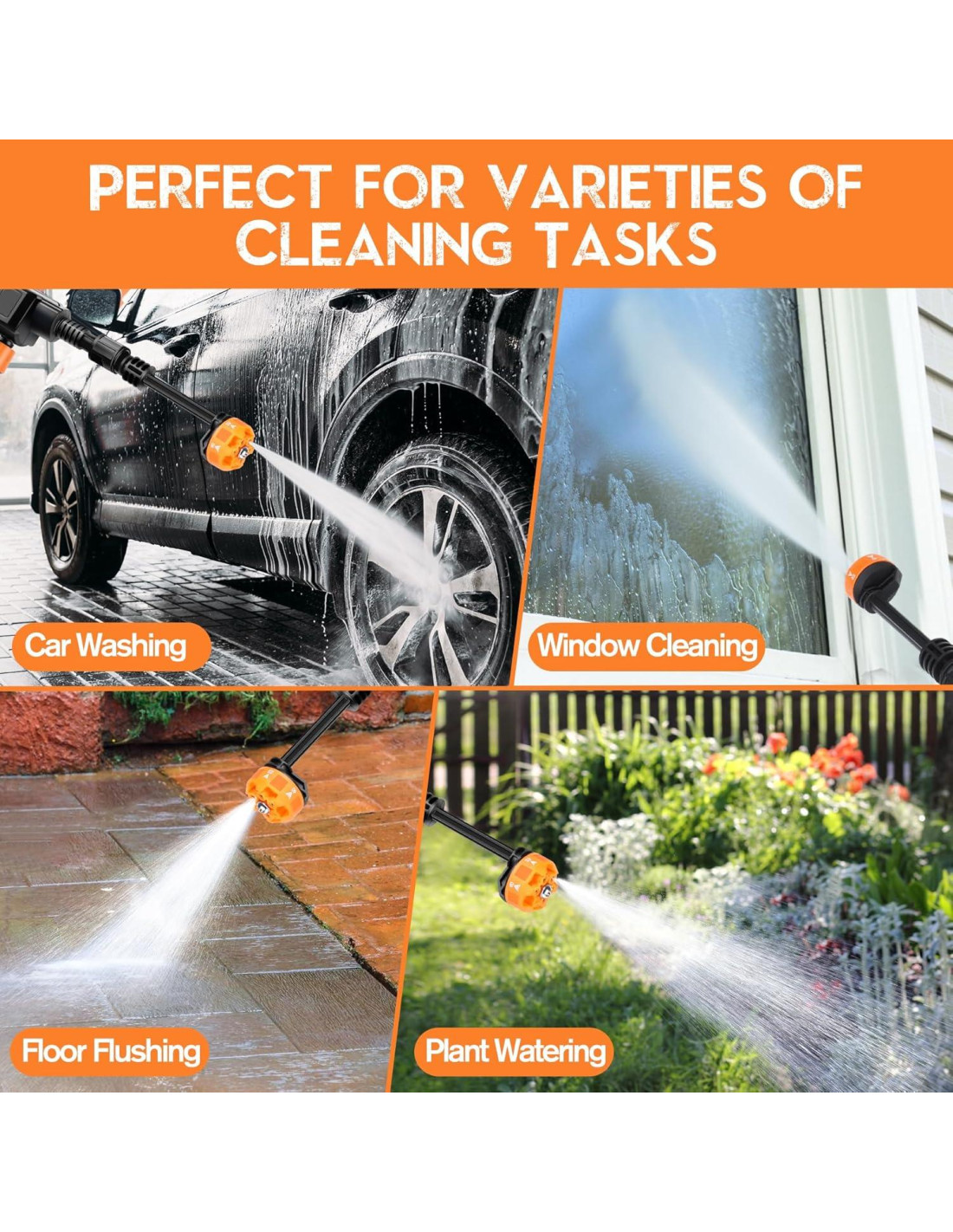 - Boquilla Multifuncional: Esta lavadora a presión de alta presión está equipada con una boquilla multifuncional que le permite cambiar fácilmente entre diferentes modos de agua al girar la boquilla, incluyendo 0/15/25/40/ rociado/ modo inclinado de 45 para satisfacer sus diversas necesidades. Además, la lavadora a presión inalámbrica viene con un recipiente de espuma, puede agregar detergente, producirá una espuma densa. Esta versatilidad asegura que pueda abordar una amplia gama de trabajos de limpieza con precisión.