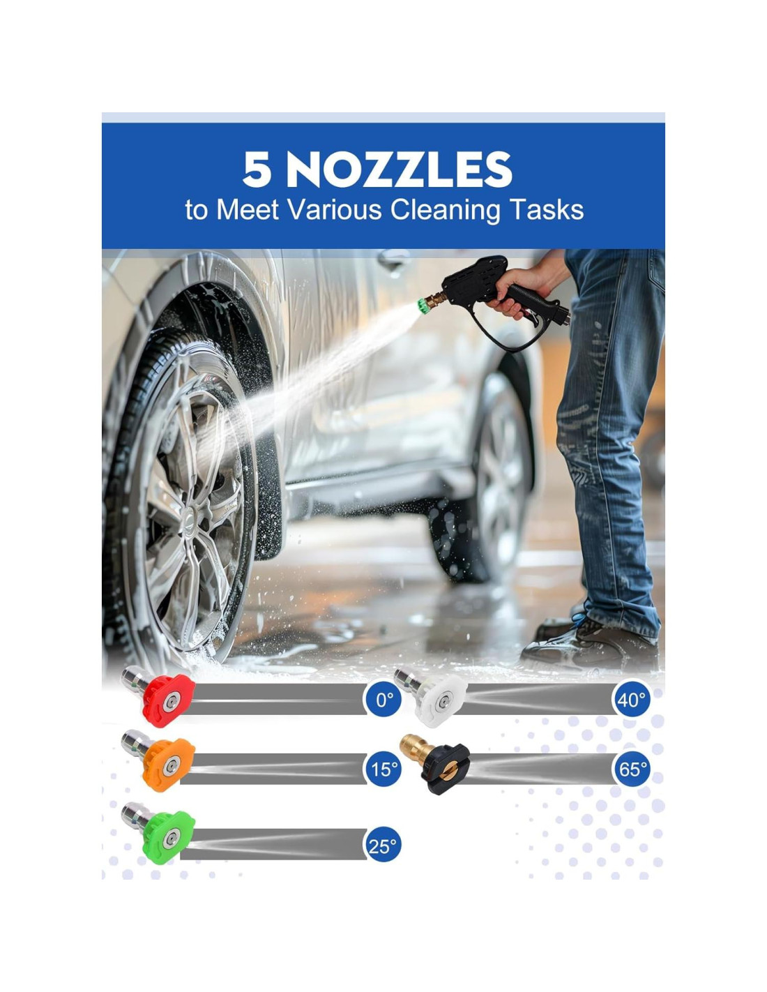 - [Modos de Boquilla Ajustables]: Ofrecemos 5 ángulos de boquilla (0, 15, 25, 40, 65), lo que te permite alternar entre un chorro concentrado para limpieza profunda y un rociado más amplio para cubrir rápidamente áreas más grandes. La pistola de lavadora a presión es perfecta para limpiar entradas, jardines, terrazas, cercas, vehículos, autos, muebles de exterior y más.
