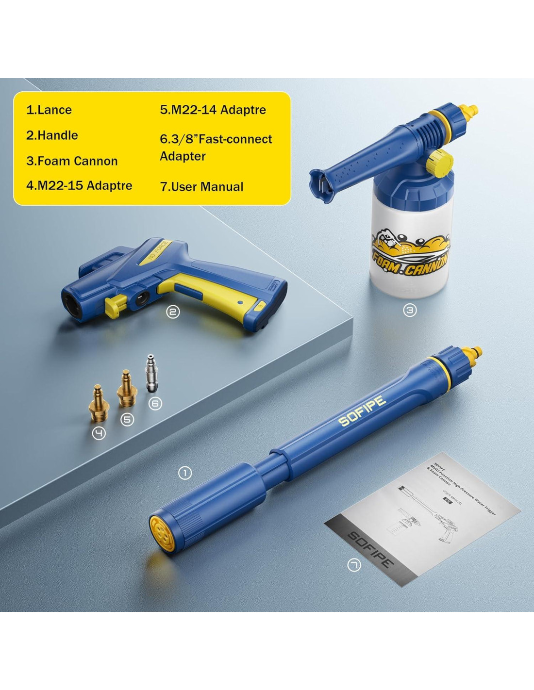 La Pistola de Lavado a Presión 5-en-1 de SOFIPE es. Incluye adaptadores M22-14, M22-15 y un adaptador de conexión rápida de 3/8" diseñados específicamente para mangueras de alta presión de lavadoras a presión.