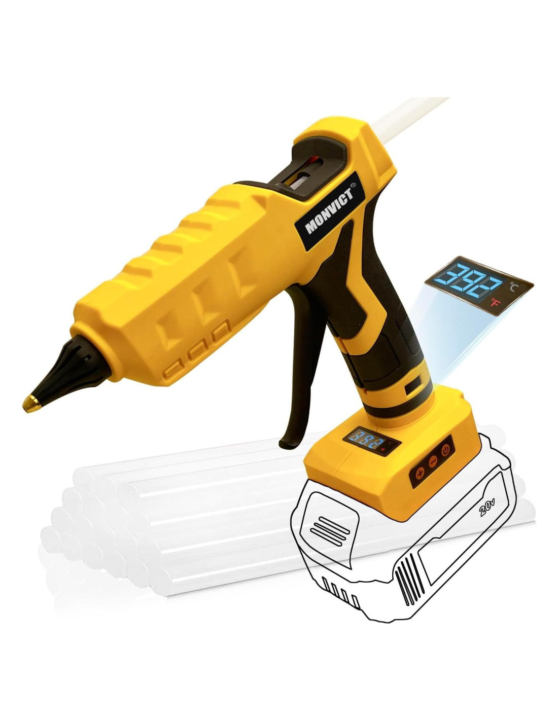 - LED Pantalla Digital & Ajuste de Temperatura - La pistola de pegamento inalámbrica MONVICT actualizada cuenta con una pantalla digital y funciones de ajuste de temperatura. Puedes monitorear la temperatura de la pistola de pegamento y establecer la temperatura requerida al usar diferentes tipos de barras de pegamento. El rango de ajuste de temperatura va de 212F (100C) a 392F (200C), lo que la hace más segura y ayuda a conservar la energía de la batería. Cuando parpadea el código 'E01' en la pantalla LED, es un recordatorio de que tu batería está baja y necesita ser recargada.