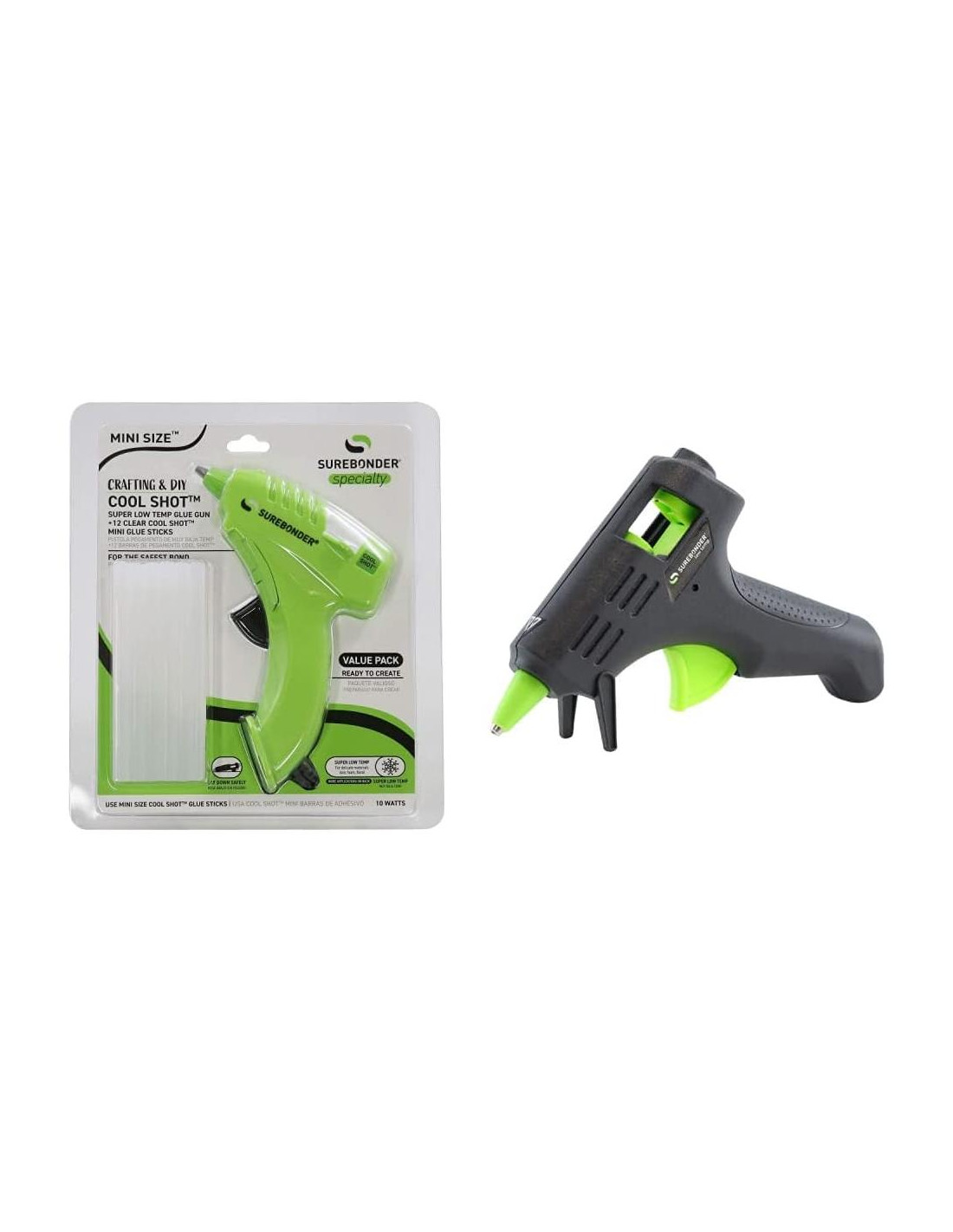 Surebonder Ultra Baja Temperatura Cool Shot Mini Pistola de Pegamento, Tamaño Compacto, Extra Seguro a 10 Vatios, Une Materiales Delicados Como Papel, Tela, Espuma, Flores, 12 Barras Incluidas (Plus Series KD-160FKIT) Esta herramienta segura y a buen precio tiene sentido para aquellos que aún están aprendiendo a usar pistolas de pegamento y/o para proyectos que no necesitan pegamento muy caliente para la unión de materiales. Tenga en cuenta que el pegamento es una fórmula única que se derrite a una temperatura más baja para permitir un trabajo más seguro con el tiempo de secado del pegamento caliente estándar. Se incluyen 12 barras de pegamento Cool Shot. El tamaño compacto hace que la pistola sea fácil de preparar, usar, limpiar y almacenar. Recomendado para jóvenes de 14 años o más. Elija este modelo de baja temperatura capaz cada vez que su proyecto se beneficie de un pegamento que esté lo suficientemente caliente como para derretirse. Una excelente opción para usuarios nuevos o inexpertos que necesitan la facilidad de funcionamiento y características de seguridad sin el posible peligro de un pegamento muy caliente. Surebonder LT-160 Mini Pistola de Pegamento de Baja Temperatura, 10 vatios Multicolor Las mini pistolas de pegamento de baja temperatura son ideales para manualidades, proyectos florales y de bricolaje. Use baja temperatura para unir materiales delicados como encaje, cinta de papel de aluminio, forma floral y tela ligera. Utiliza barras de pegamento de 4 pulgadas (10.16 cm) o 10 pulgadas (25.4 cm) con un diámetro de 5/16 pulgadas (0.79 cm). Esta pistola derrite el pegamento a una temperatura más baja que las pistolas de pegamento de alta temperatura, lo que la convierte en una forma más segura de pegar. Enchufe el cable para la energía y desenchufe inmediatamente después de usar. Inserte la barra de pegamento en la cámara, tire del gatillo para avanzar el pegamento. 10 vatios, 120 voltios.