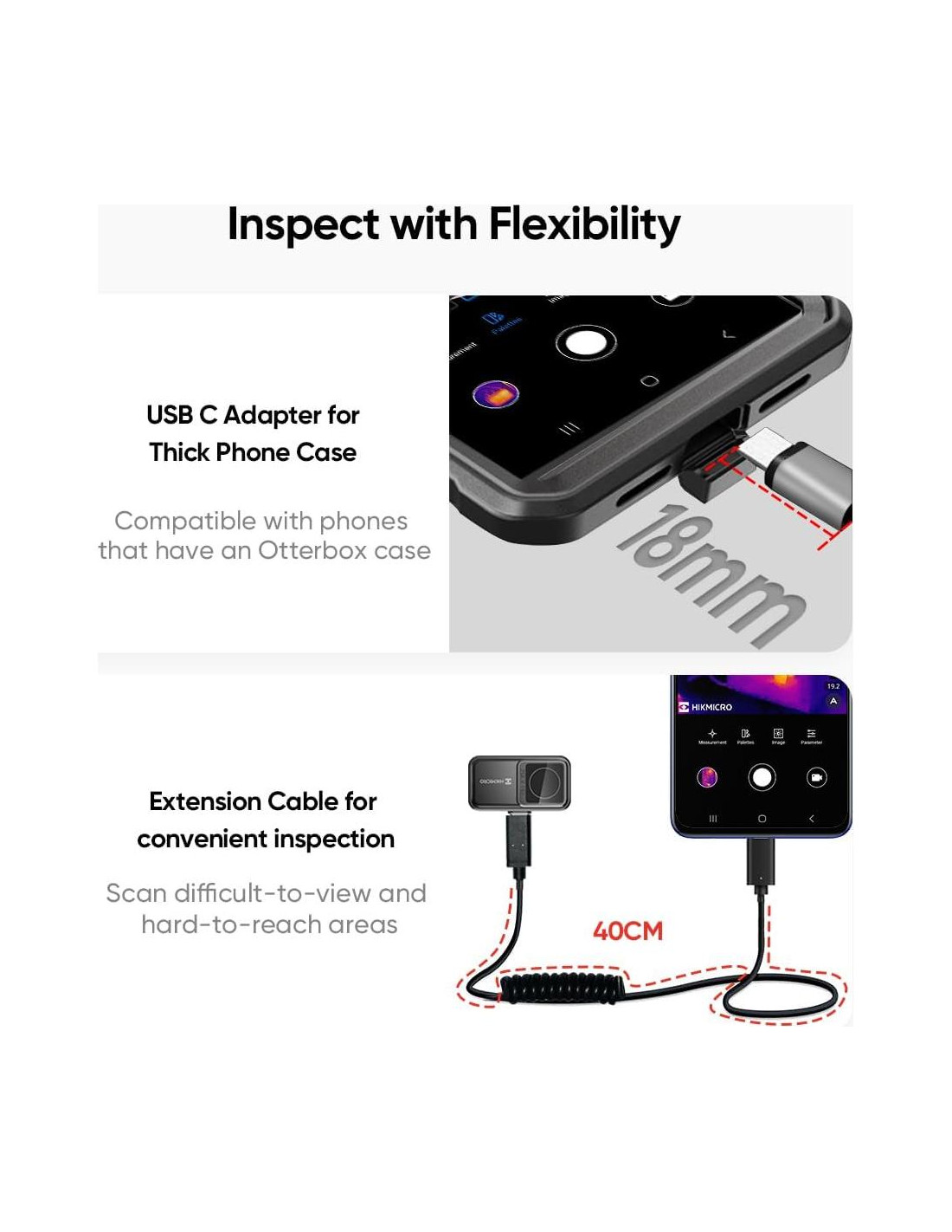 - [Fácil de Usar] (1) Conéctala y juega en tu smartphone o tablet Android y la máquina de imágenes térmicas Mini2 estará lista en segundos. (2) La función de auto-rotación sincroniza automáticamente la pantalla con la dirección de la toma. La rotación manual de "90" y el cable de extensión permiten inspeccionar de manera flexible en cualquier lugar.