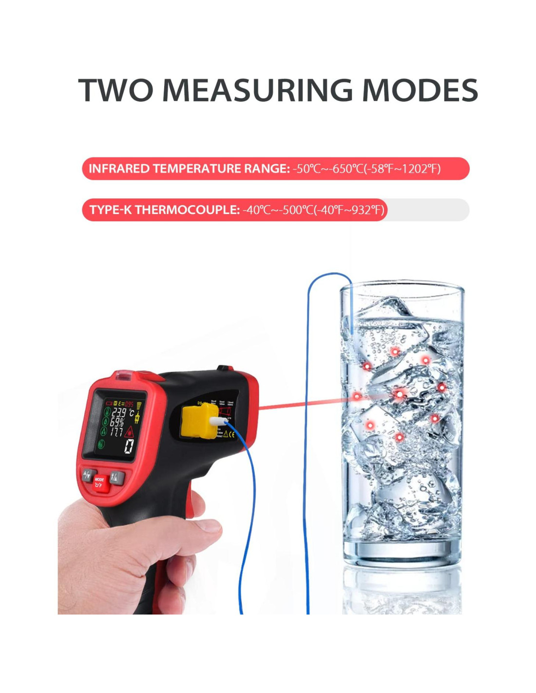 - CUATRO MODOS DE VISUALIZACIÓN: Termómetro Infrarrojo con higrómetro incorporado con una indicación de luz tricolor a medida que la lectura se acerca a la temperatura del punto de rocío, y lee la temperatura del aire ambiente, humedad relativa y punto de rocío en la gran pantalla LCD retroiluminada de múltiples líneas