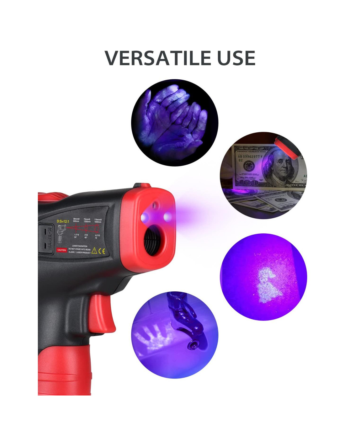 - MULTIFUNCIONAL: Este termómetro láser con interruptor C/F y luz UV, retención de datos, indicador de batería baja, función de apagado automático para entornos domésticos e industriales, cocción de alimentos, horneado en horno, parrillado, congelación, elaboración, HVAC, reparación automotriz y más