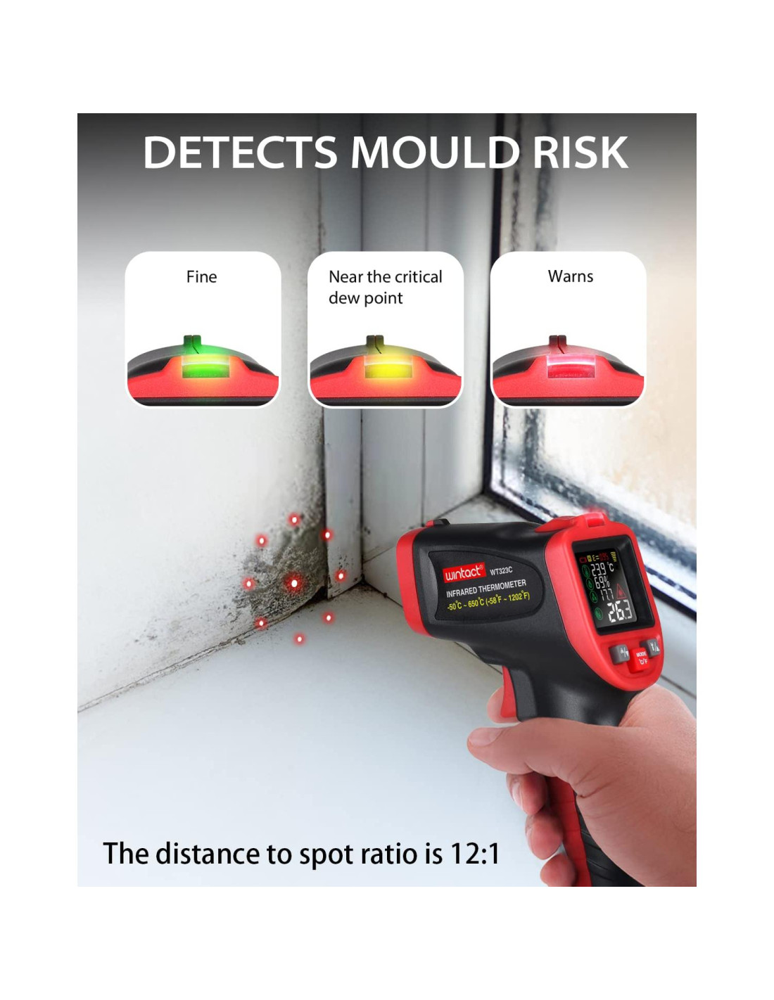 Wintact fue establecida en 2010 en respuesta a una urgente necesidad mundial en la industria, seguridad y protección, reparación automotriz y agricultura, y vida diaria en el campo de la Medición de Temperatura, etc. Estamos dedicados a ofrecerte una opción donde la combinación de calidad y rendimiento crea un valor excepcional. Puedes leer temperaturas de superficie de -50 C a 600 C con una precisión de +/-2.7F (+/-1.5C). Detecta el riesgo de moho al determinar el clima de la habitación y el punto de rocío, con un LED de advertencia de semáforo. La longitud de onda de la luz UV ayuda a detectar orina de animales y manchas de comida en alfombras que no se pueden ver a simple vista. Verifica con precisión las temperaturas de superficies y líquidos con el sensor de temperatura de termopar más confiable. Termómetro infrarrojo que mide la temperatura ambiente y también tiene un sensor de humedad integrado. Pantalla grande, retroiluminada y a color para una fácil lectura, incluso en la oscuridad. Puedes cambiar fácilmente la emisividad de 0.1 a 1.0 para medir una variedad de superficies diferentes. La pistola de temperatura congelará las lecturas para que puedas registrarlas fácilmente. No requiere contacto con el objeto que se mide, previene la contaminación que podría ocurrir. También verás cuándo es el momento de cambiar la batería. La energía se apaga automáticamente después de 30 s de no operación. Verifica de manera segura la temperatura de la superficie del motor de tu automóvil desde una distancia. Puedes medir las temperaturas de superficie de alimentos, hornos de pizza o parrillas. Mide fácilmente la temperatura de superficie de tu unidad de aire acondicionado. Mantén a tus mascotas cómodas midiendo la temperatura y humedad de su entorno. Mide con precisión las temperaturas de fluidos para cualquier proyecto. Ten cuidado, no puedes usar esta pistola de temperatura para humanos. Eso es porque no te dará lecturas precisas. Las lecturas de este termómetro son para objetos inanimados. Principalmente se utiliza para medir la temperatura en la cocina industrial y de cocina. Para una lectura precisa, no pases a través de humo o vapor. WT323C WT320 WT327A WT300 WT550 WT327B
