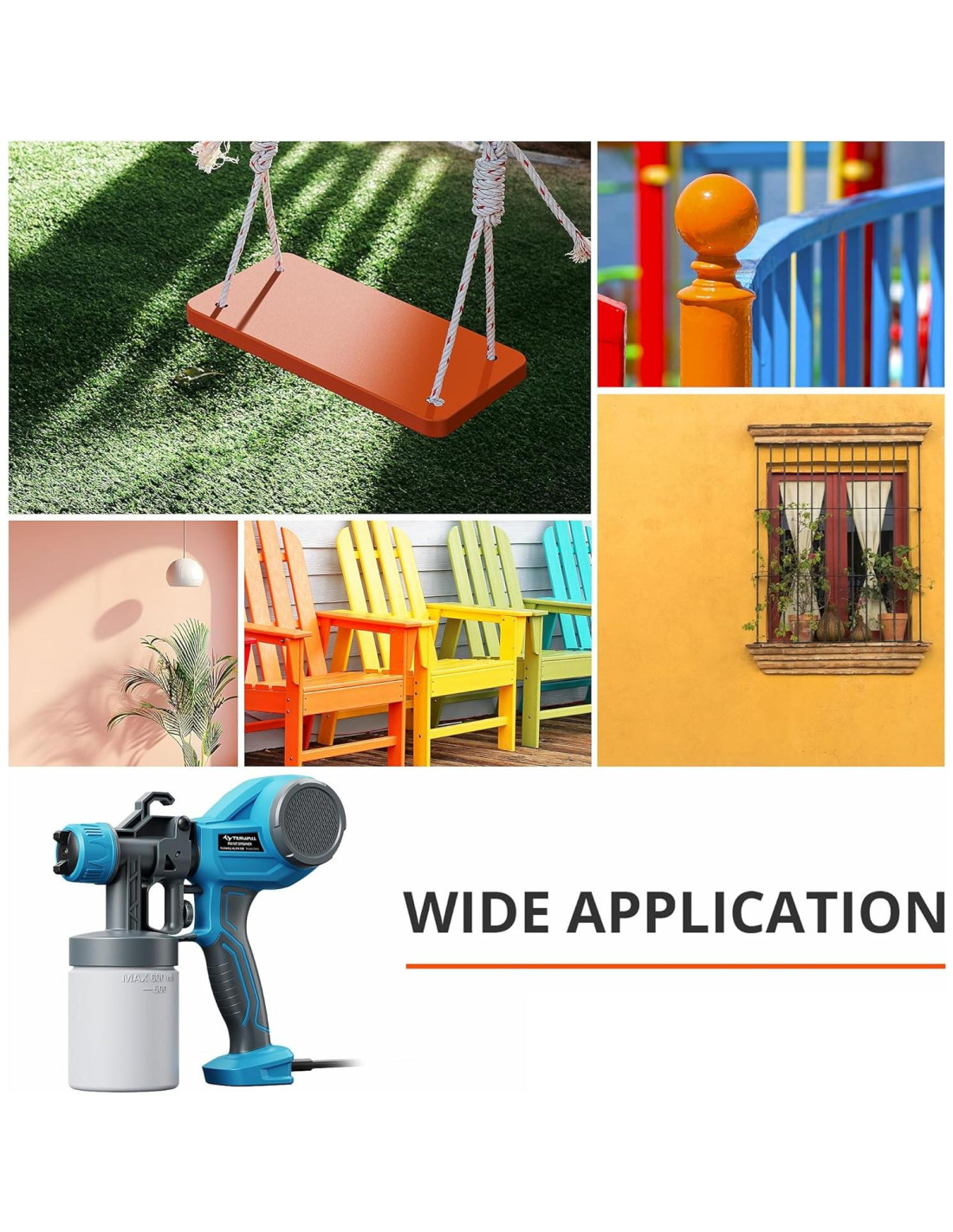 - [Botón de Control de Flujo Ajustable] El botón ajustable en nuestro sistema de pistola de pintura eléctrica controla el flujo de pintura para un rociado preciso y uniforme. Ten en cuenta, asegúrate de diluir la pintura antes de usarla, esto te ayudará a rociar un acabado más uniforme y suave, y el efecto de rociado se mejorará aún más. Esta pistola de pintura eléctrica es ideal para rociar cercas, terrazas, muebles, gabinetes, paredes, mesas, sillas y muchas otras escenas.