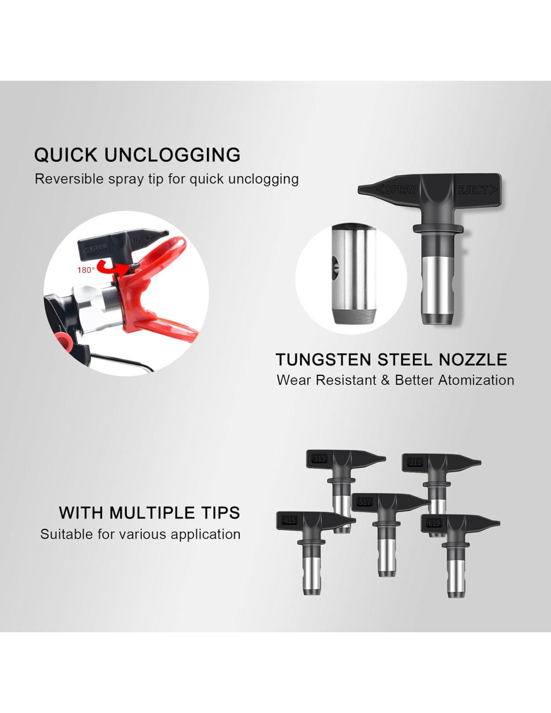 - Versátil para la mayoría de las aplicaciones La pistola de pulverización airless incluye 5 puntas intercambiables (311, 313, 415, 517, 619) que se pueden usar en una variedad de superficies, como paredes interiores y exteriores, puertas, canaletas, gabinetes y cercas. Esta pistola de pulverización airless requiere un pulverizador de pintura airless para su uso.
