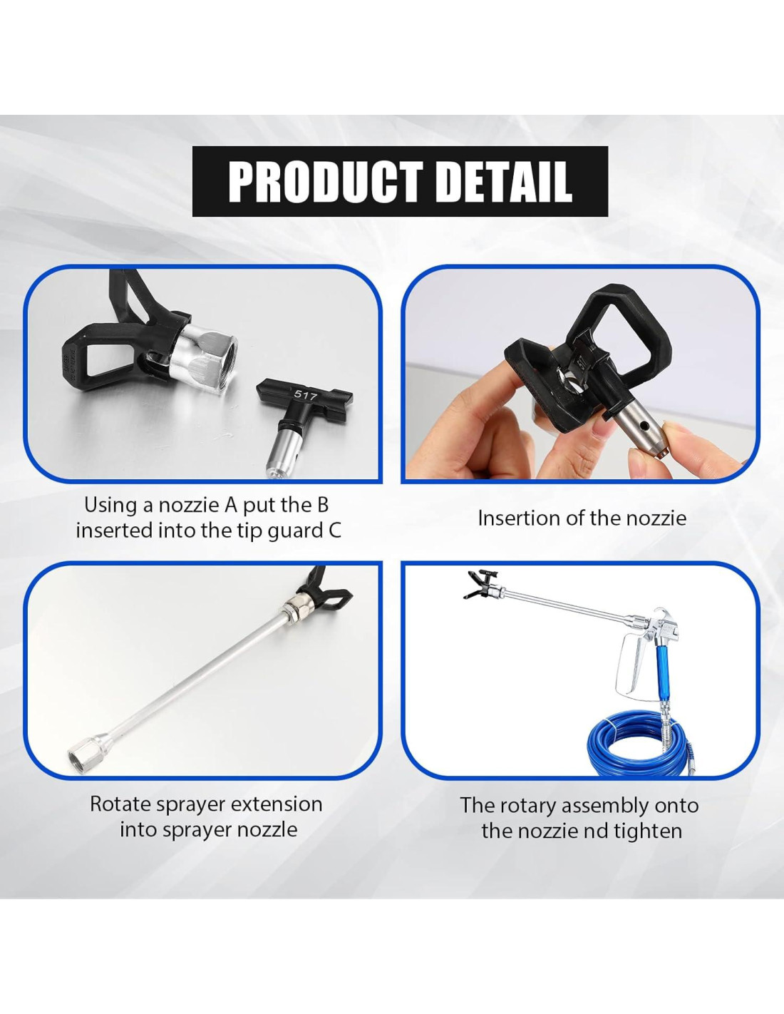 - Componentes incluidos: 3 x Extensiones de punta de pistola de pulverización sin aire, 5 x Punta de pulverizador con sello de boquilla, 1 x Protector de punta de ajuste manual, 1 x Manguera de fibra de alta presión de 50ft 3600psi, 1 x Pistola de pulverización sin aire, 5 x Filtros de malla para pistola de pulverización sin aire