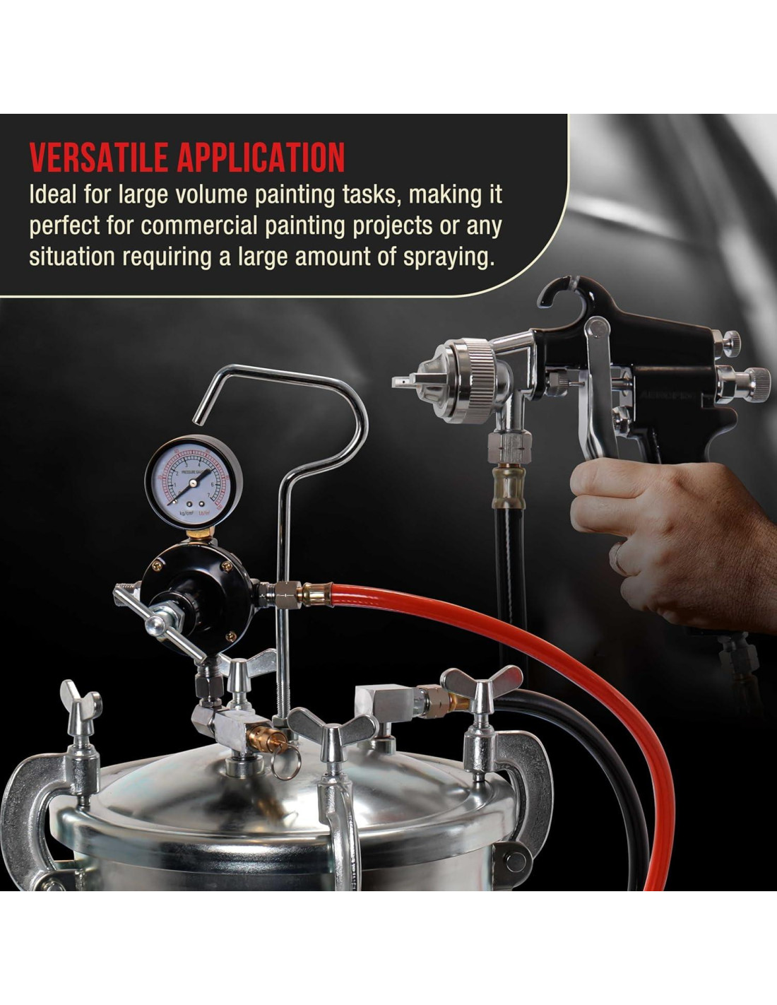 - Solución Completa de Pintura: Incluye tanque de pintura a presión de 2-1/2 Galón (10 Litros) de acero sólido de alta resistencia con tapa con abrazadera, regulador, manómetro, pistola de pintura y mangueras para un conjunto de pintura integral.