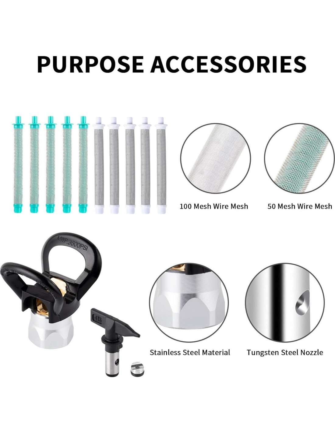 - Kit de Pistola de Pulverización de Pintura Sin Aire: El kit de pistola de pulverización de pintura sin aire incluye una pistola de pulverización de pintura sin aire, un protector de boquilla, 5 puntas de pulverización reversibles, 10 filtros de malla para pistola de pulverización de pintura sin aire, proporcionándote todo lo que necesitas para el uso diario y reemplazos.