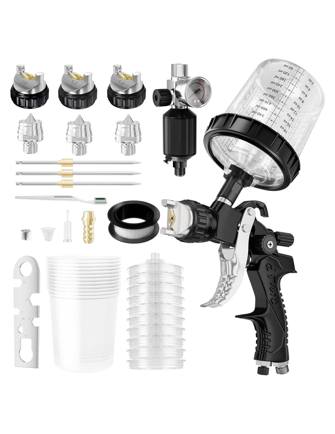 - [Ahorro de Costos y Mano de Obra] El paquete de la pistola de pintura contiene: 1* pistola de pintura para coche, 3 tipos de boquillas, 10* tazas desechables, 1* regulador, 1* cepillo, 1* llave, 1* cinta de sellado. Al utilizar el sistema de tazas desechables, se reduce el desperdicio de materiales de pintura y disolventes de limpieza, eliminando los costos y la mano de obra de limpiar las tazas de pistola de pulverización automotriz tradicionales.