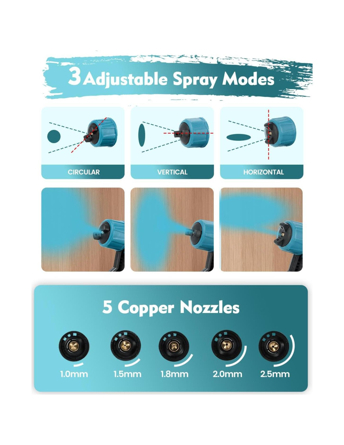 - Patrón de Rocío Ajustable / Flujo / Longitud: 3 Patrones ajustables: horizontal, vertical, circular. El volumen de rociado, la longitud también se pueden ajustar. 5 boquillas de cobre en diferentes tamaños (1.0/1.5/1.8/2.0/2.5mm). 1 de ellas ya está preinstalada en la pistola de pintura HVLP para pintura de casas.