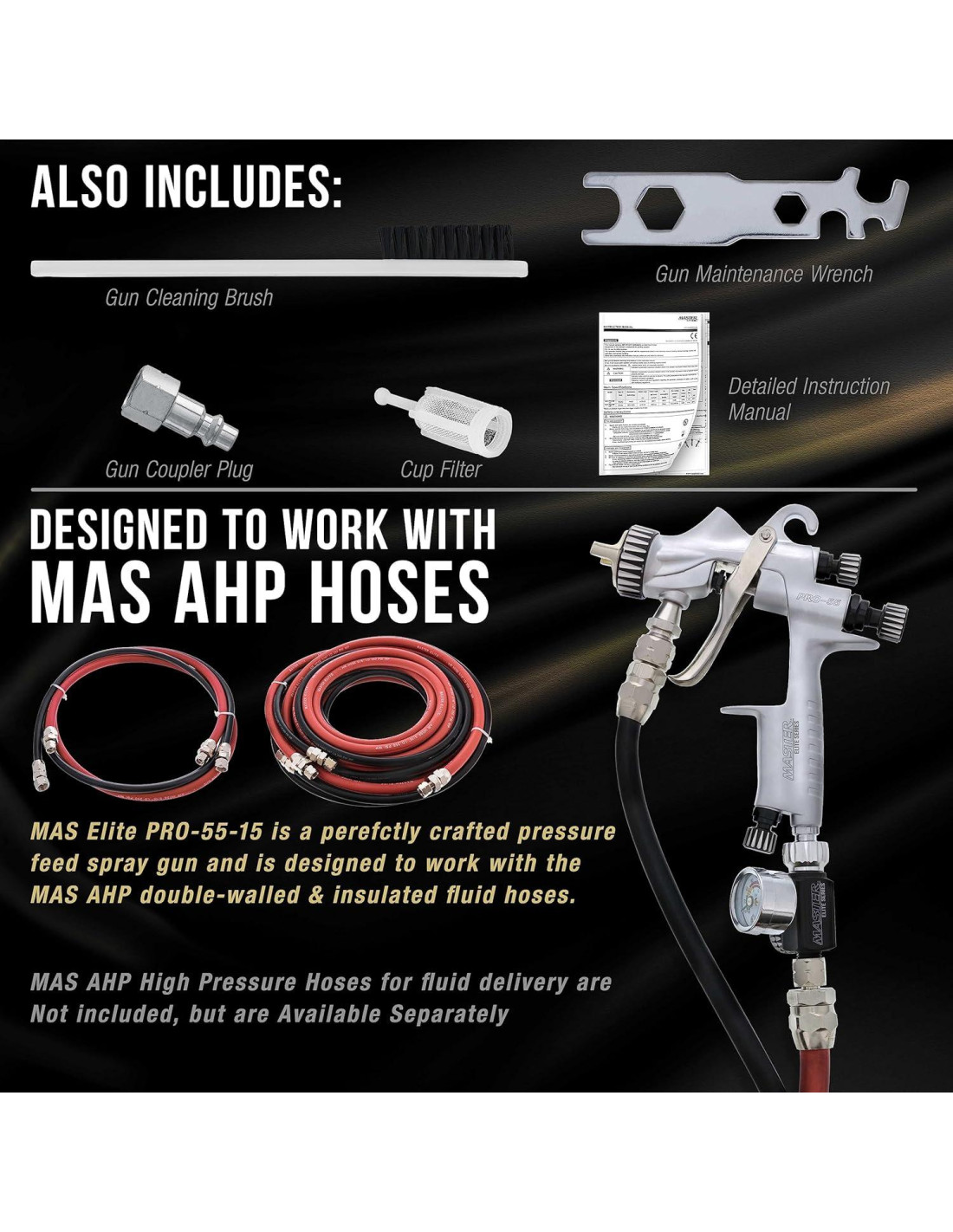 - Pistola de Pulverización de Alimentación por Presión de la Serie Master Elite: Pistola de Pulverización HVLP de Alto Rendimiento PRO-55 de Master Elite con una Punta de Fluido de 1.5mm. Esta configuración de punta de 1.5 mm es ideal para su uso con base coats, clear coats, una sola etapa, primers y otros materiales de recubrimiento de pintura de viscosidad ligera a media.