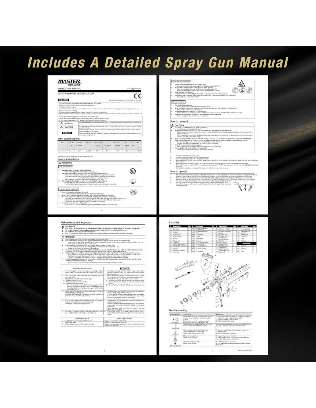 - Rendimiento Master: Nuestras pistolas de pulverización de la Serie Master Elite están diseñadas pensando en el pintor profesional. Todos los componentes de la pistola están fabricados con precisión exacta, por lo que ofrecen un rendimiento premium con todo tipo de recubrimientos automotrices, industriales y de carpintería.