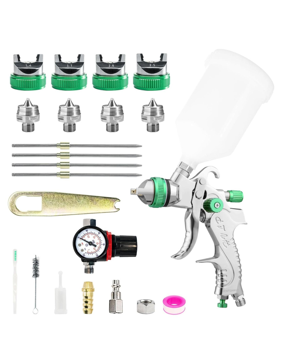 - ASEGURAMIENTO DE CALIDAD PROFESIONAL: El cuerpo de la pistola de pulverización H-2008 está hecho de una sola pieza de aleación de aluminio y la boquilla es de acero inoxidable, lo que es más duradero. Cada pistola de pulverización HVLP se somete a rigurosas pruebas de calidad para garantizar un alto rendimiento duradero. Ideal tanto para proyectos profesionales como de bricolaje, este kit de pistola de pulverización hvlp viene con múltiples boquillas ajustables para alta precisión y versatilidad.