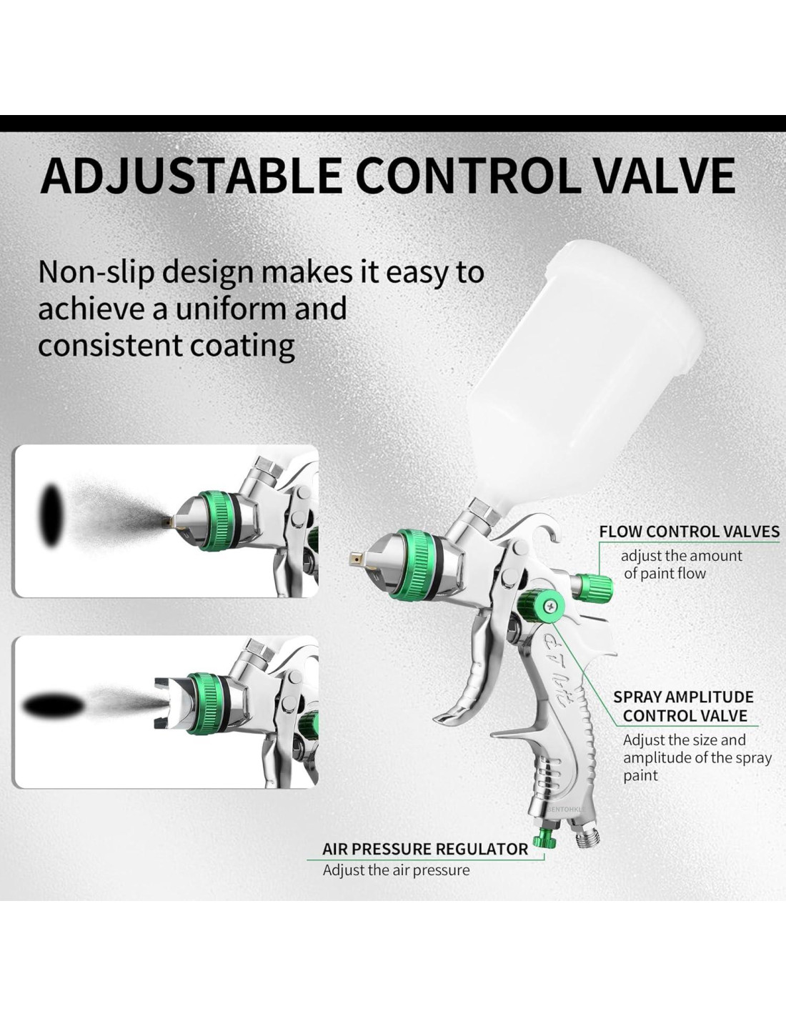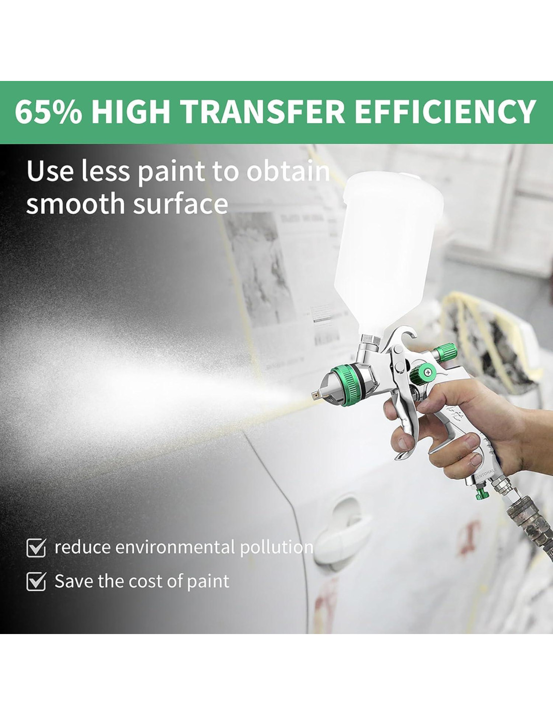 - AMIGABLE CON EL MEDIO AMBIENTE Y ECONÓMICO: Equipado con tecnología de compresión de aire eficiente, reduce el desperdicio de pintura y la evaporación de solventes durante la pulverización, minimizando el impacto ambiental y ahorrando costos, convirtiéndolo en la mejor opción para consumidores conscientes del medio ambiente.