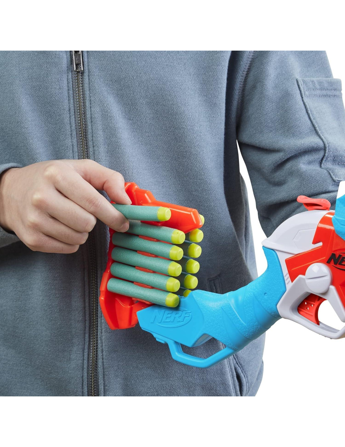 - 12 DARDOS NERF Y ALMACENAMIENTO DE DARDOS: Viene con 12 dardos de espuma Nerf Elite oficiales: el blaster tiene almacenamiento a bordo para 12 dardos, para mantenerlos al alcance para recargar.