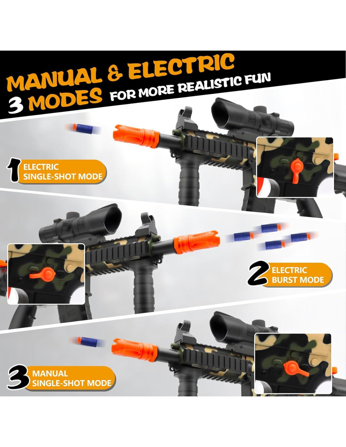 - [Manual y Eléctrico con 3 Modos de Disparo para Más Diversión Realista] La pistola de dardos eléctrica cuenta con modos de disparo eléctrico de un solo tiro, ráfaga eléctrica y un solo tiro manual, con diferentes modos para satisfacer las necesidades de disparo divertido solo con la pistola de dardos suaves EagleGrove. Puedes cambiar en cualquier momento cuando no haya energía o cuando desees cambiar a manual y no estar limitado por las baterías. Cambia para seleccionar el modo que te guste y presiona el gatillo para disparar dardos.