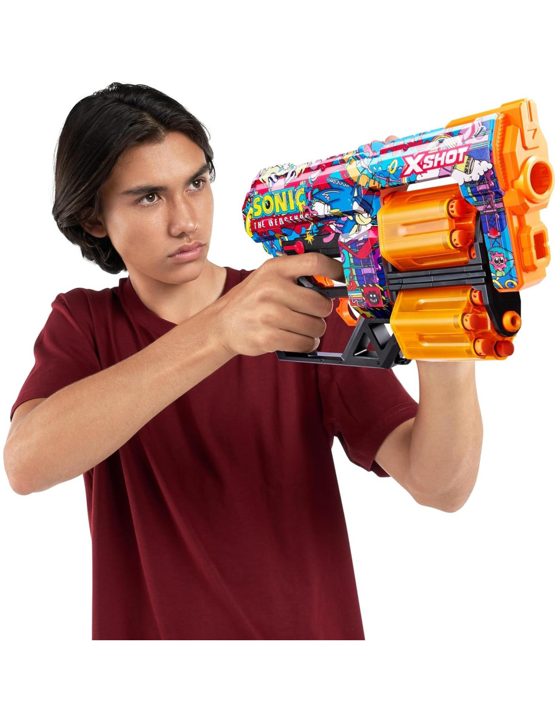 ¡Personaliza tu blaster con la velocidad supersónica de Sonic the Hedgehog! Con una capacidad de 12 dardos, los cañones rotativos de doble problema del XSHOT Skins Dread significan que estás listo para la diversión. Cuando te quedes sin dardos en un cañón, cambia al segundo y dispara a la competencia desde hasta 27m (90 pies) de distancia. Busca todos los 6 Skins de Sonic the Hedgehog y encuentra los blasters raros. Elige diferente, elige XSHOT Skins.
