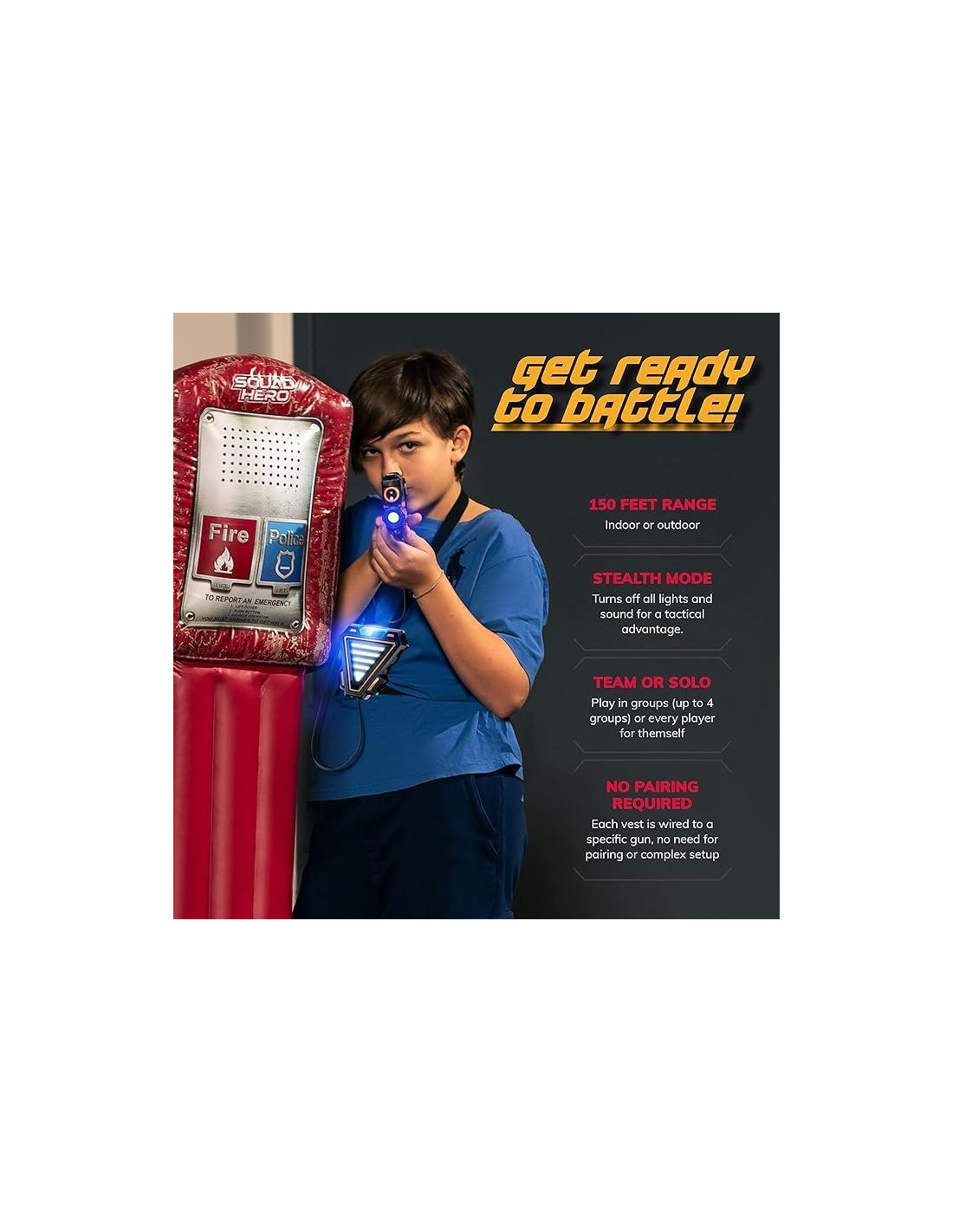 - Más características avanzadas... Elige entre dos modos de arma (Pistola y Automático); Modo Sigiloso; Modo de Equipo o Solo; alcance de 150 pies (45,72 m); puedes agregar pistolas y chalecos ilimitados ya que todos los sets de Laser Tag LightForce de Squad Hero son compatibles. Todo esto hace que Laser Tag LightForce sea un intenso, de alta tecnología y, en general, un increíble juego de laser tag infrarrojo basado en el hogar.