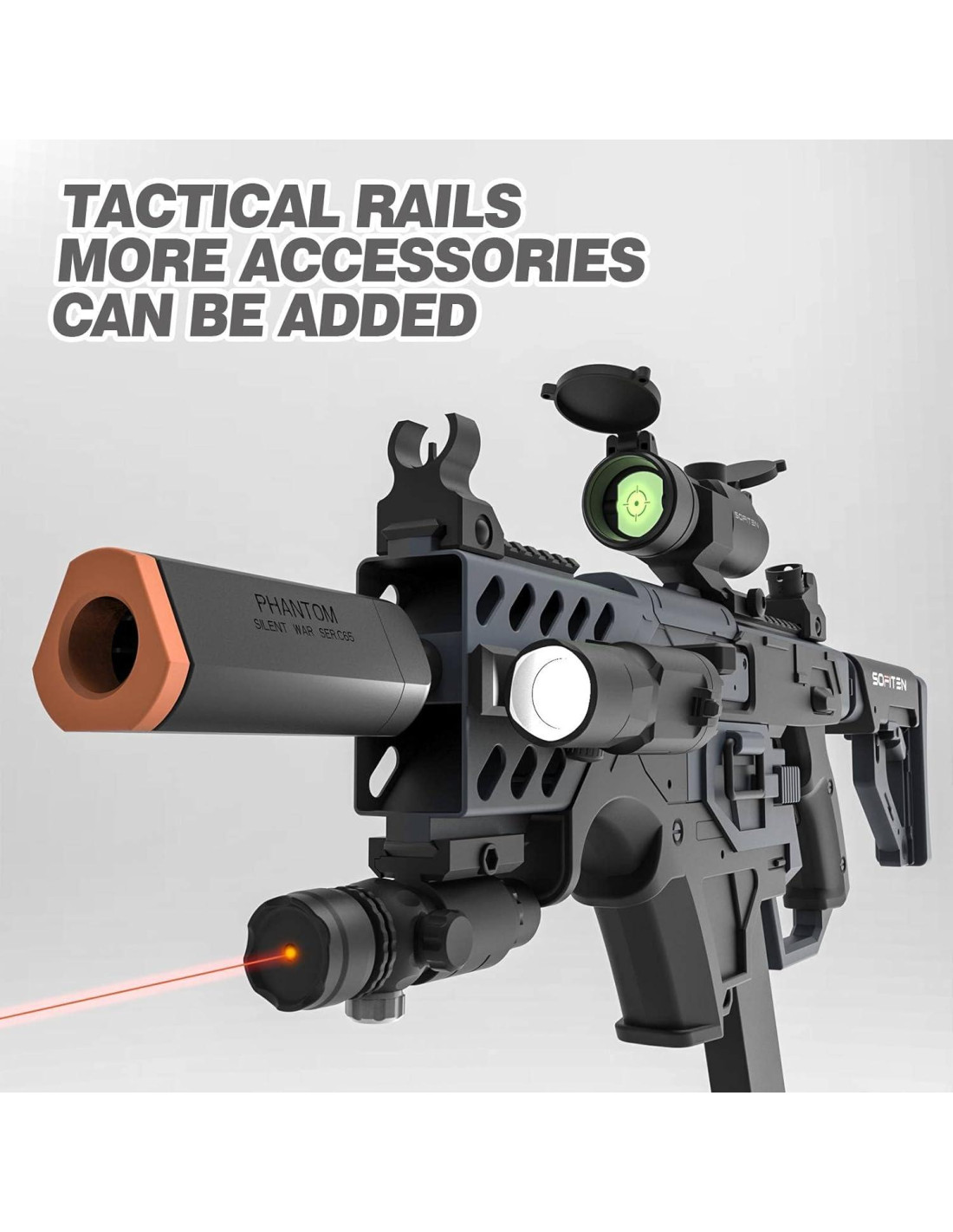 - Accesorios tácticos: Para mejorar la experiencia de los jugadores, equipamos con 1* infrarrojo, 1* linterna, 1* aumento de magnificación ajustable, 1* mira delantera y trasera, 1* set recargable, 60* conchas, 60* balas suaves, 1* cargador, 1* cañón normal, 1* boca reforzada.