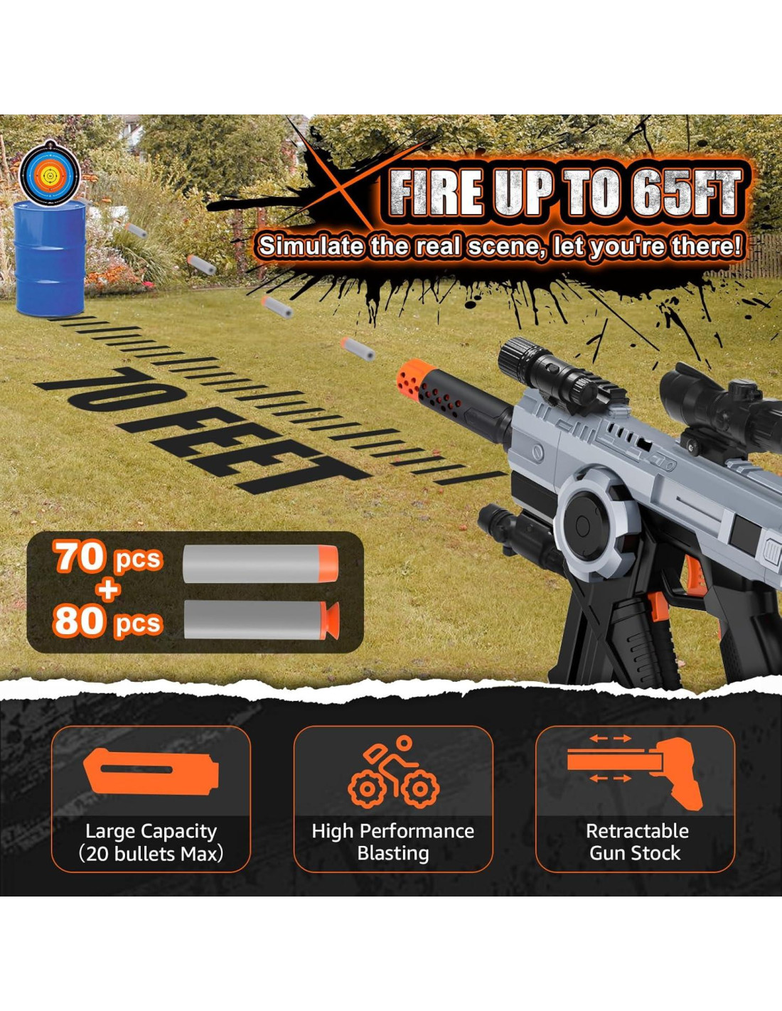 - Accesorios Abundantes: Este conjunto de pistola de juguete viene con todos los accesorios: chaleco táctico, gafas, IR, mira y linterna, 2 cargadores de 20 dardos y 150 balas suaves. Los niños pueden participar en emocionantes batallas de blasters de dardos con amigos y familiares. La abundancia de accesorios asegura diversión y emoción sin parar.