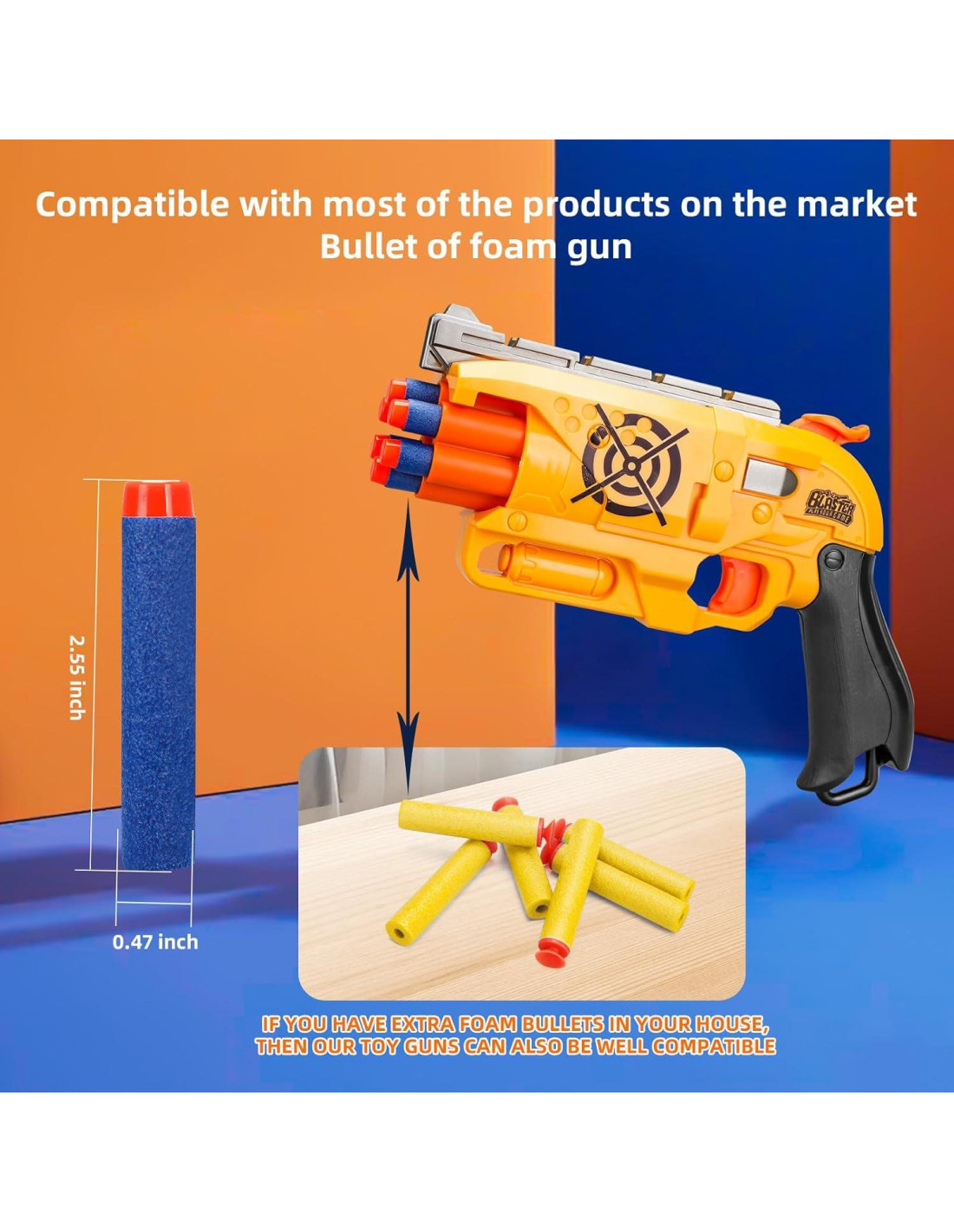 - [El Conjunto de Pistolas Blaster Más Nuevo] ¿Listo para la diversión de los juegos de pistolas que cobran vida? ¡Mira nuestra última serie de pistolas blaster! Nuestro conjunto de pistolas de juguete contiene 2 grandes pistolas blaster, 80 dardos de espuma suave elite, 2 objetivos y 2 bandas para la muñeca para almacenar los dardos. En comparación con otros productos existentes en el mercado, nuestro conjunto de pistolas crea más posibilidades de diversión para que los niños disfruten de los momentos divertidos de jugar a la pistola con sus amigos.
