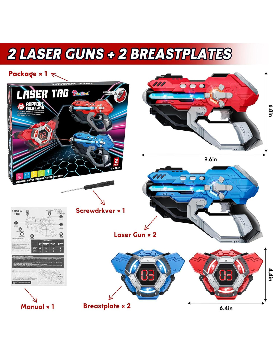 - Pistola láser multifuncional: El conjunto de pistolas de láser incluye 2 pistolas y 2 chalecos. Dos equipos pueden batallar. Hay cuatro tipos de pistolas para elegir: disparo único / pistola láser / ametralladora / pistola de plasma. Cuatro equipos eligen. Cambia entre tus modos favoritos para intensas y emocionantes batallas.