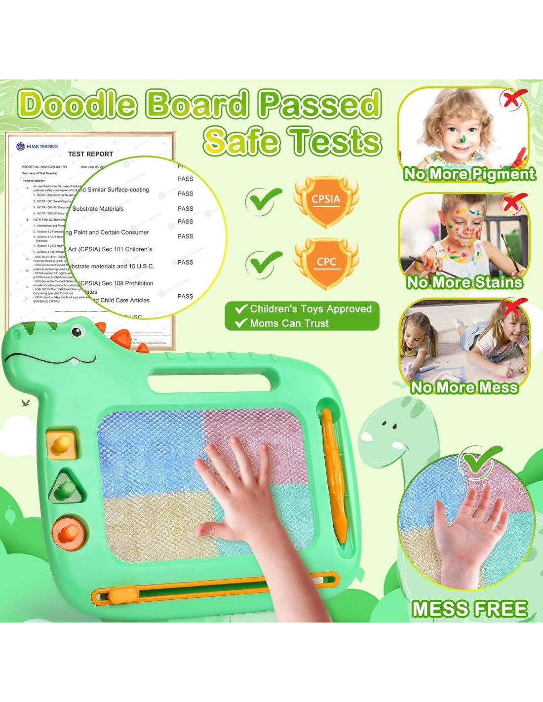 - TABLERO DE DIBUJO MAGNÉTICO DE DINOSAURIO: ¿Es tu pequeño un fanático de los dinosaurios? El lindo tablero de doodle con temática de dinosaurios añade un toque mágico, haciendo que las sesiones de dibujo sean encantadoras para niños de 1-3 años. Área de dibujo grande de 8 pulgadas (20,32 cm) con cuatro colores (rojo, azul, verde, amarillo) para líneas vívidas y suaves. 3 sellos divertidos y un bolígrafo amigable para zurdos con una cuerda que previene la ingestión accidental o la pérdida. Juguetes educativos que cumplen con los estándares de CPSIA y ASTM de EE. UU., el tablero de dibujo para niños pequeños ofrece una forma divertida, sin desorden, de explorar varios estilos artísticos.