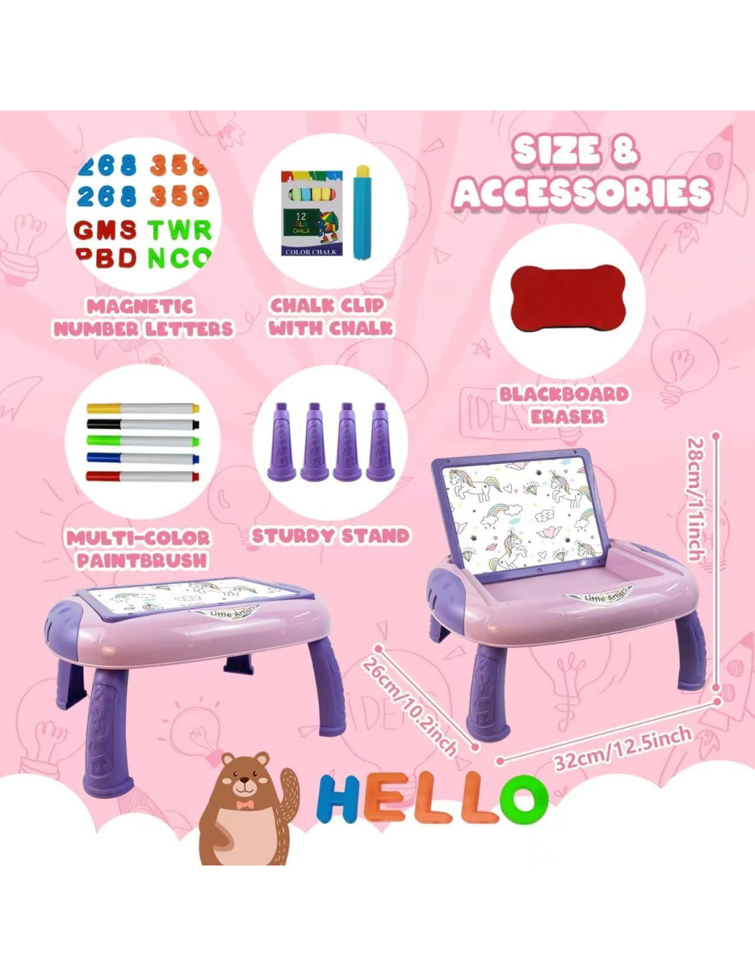 - [Accesorios Versátiles para Inspirar la Creatividad del Niño] - La mesa de dibujo para colorear del niño viene con 1 soporte para tiza, 1 borrador de pizarra, 5 bolígrafos de colores, 12 tizas, 25 plantillas de números y 26 plantillas del alfabeto en inglés. Los niños pueden aprender y dibujar a través de diferentes combinaciones de estos accesorios, y el interior y los lados de la mesa de garabatos proporcionan espacio para accesorios, lo que es más divertido que dibujar en papel.