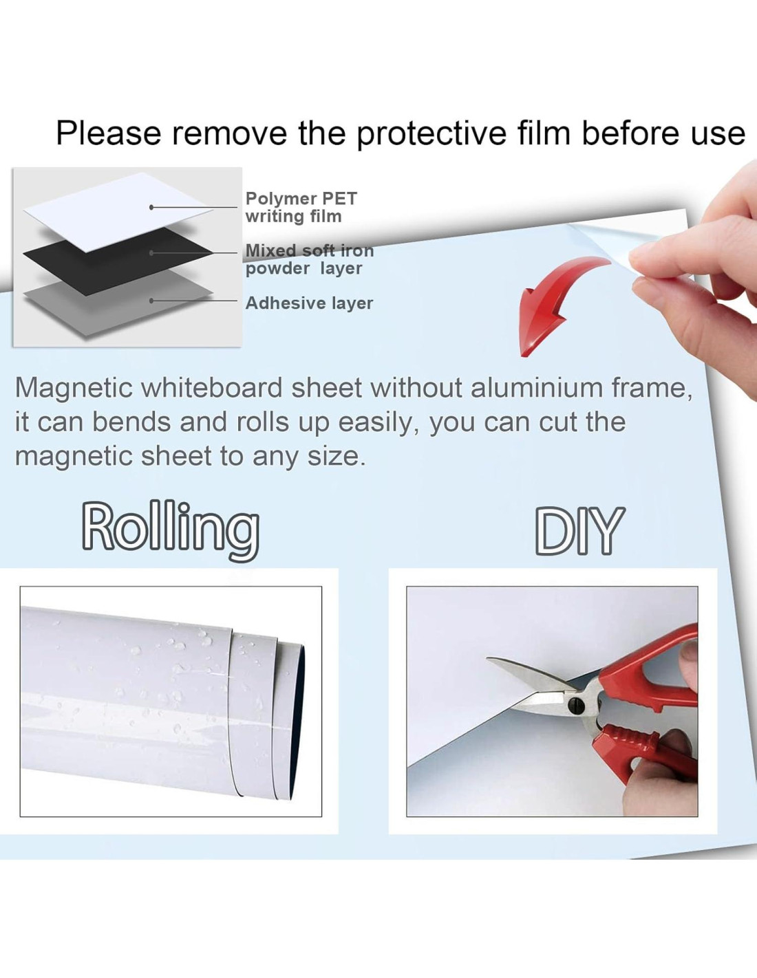 - Flexible y Cortable - Nuestras pizarra blanca de papel tapiz magnético son enrollables y cortables. Pueden cortarse fácilmente al tamaño deseado con tijeras o un cuchillo. Pega la hoja de pizarra blanca a la pared, vidrio u otras superficies lisas para proporcionar un espacio de escritura conveniente que también ahorra espacio.