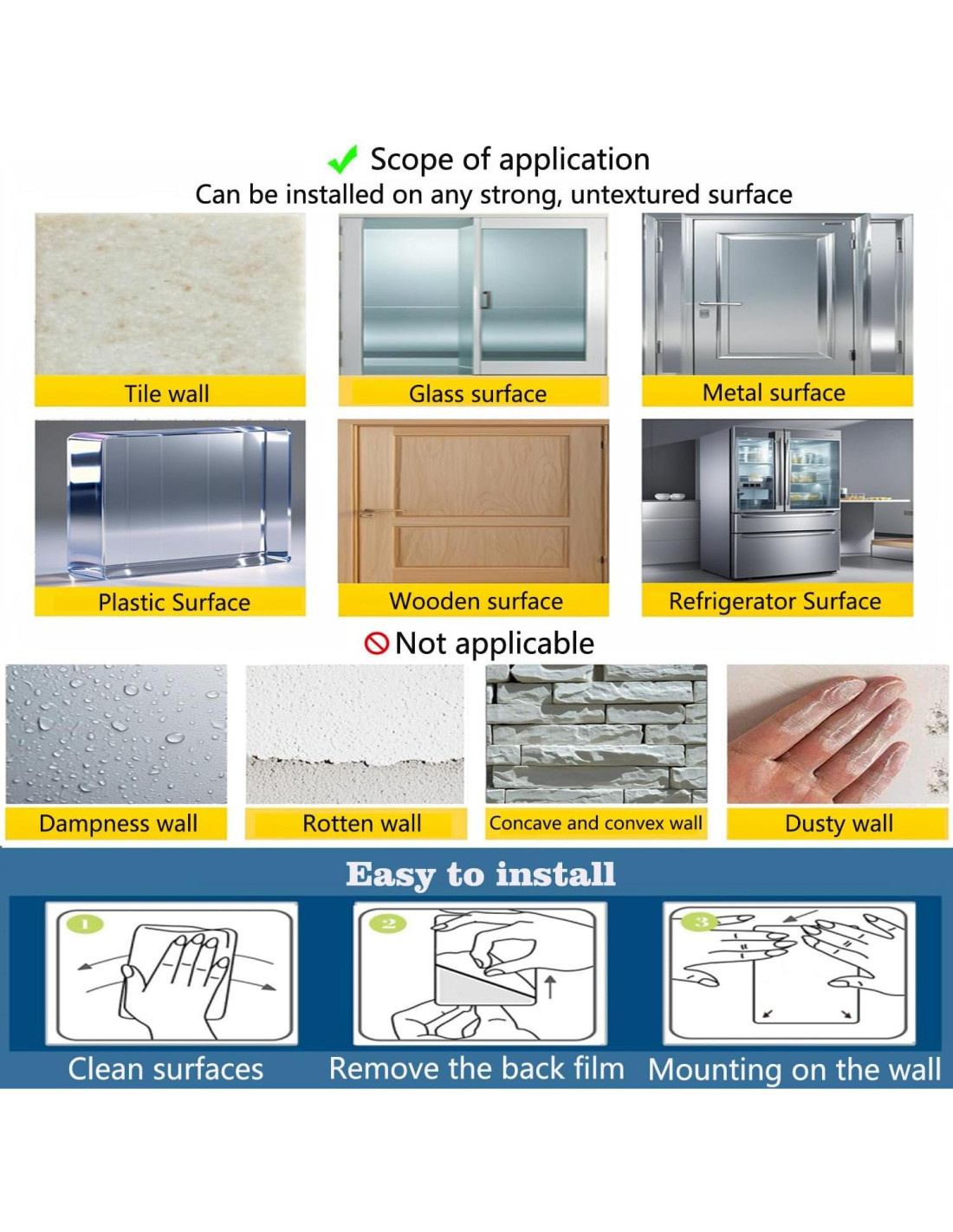 - Superfuerte adhesión, pegar y quitar, fácil de usar: El adhesivo de esta calcomanía de pizarra blanca magnética ha sido recién mejorado con una adhesión super fuerte, despidiéndose del problema de caerse. Se puede fijar firmemente a superficies lisas y no texturizadas como paredes, vidrio y metal. La instalación es extremadamente simple. Solo quita la película protectora adhesiva, posiciona y pega, y presiónalo plano para completar la transformación del espacio al instante. Emparejado con marcadores de borrado en seco, la escritura es suave. Sin embargo, se debe tener en cuenta que las superficies con mucho polvo, daños, irregularidades o humedad no son adecuadas, para no afectar el efecto.