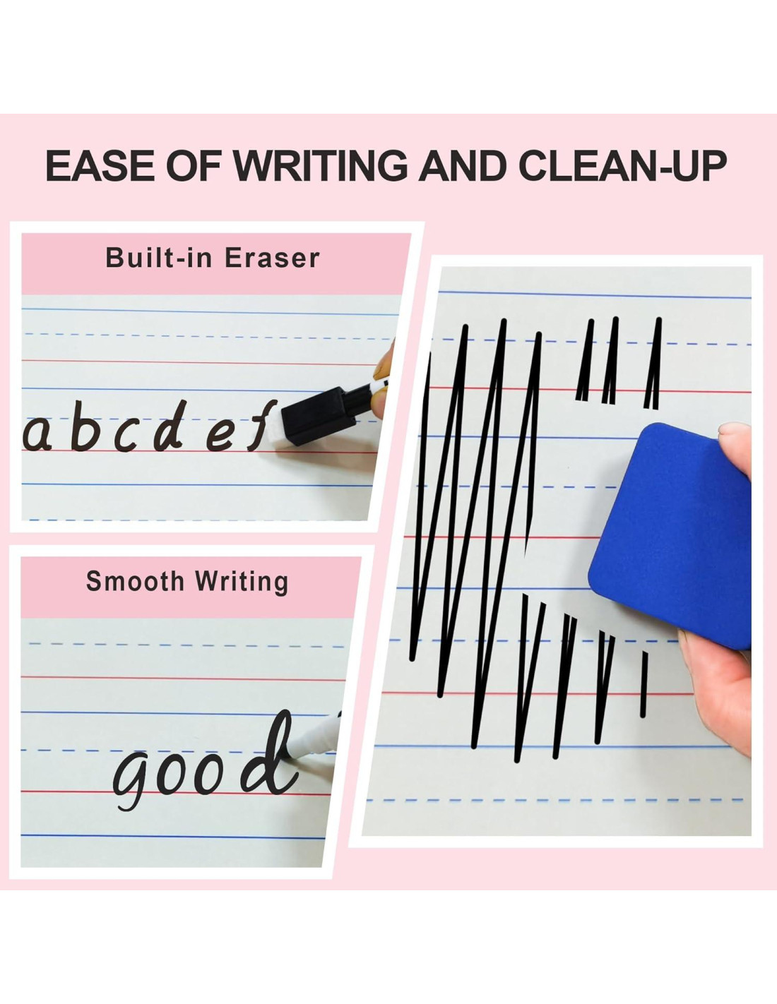 - [Doble Cara] : Un lado de la pizarra blanca para estudiantes es en blanco, el otro lado es pizarra blanca con líneas. El lado de LÍNEA se puede usar para practicar inglés o aprender matemáticas para escribir, el lado en BLANCO se puede usar para varias creaciones libres, como dibujar o jugar.
