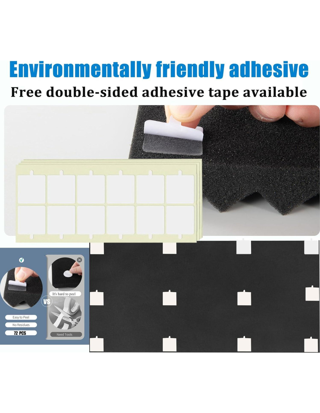 - Fácil de Instalar: nuestros paneles de amortiguación de ruido vienen con cinta adhesiva doble y notas de instalación, 18 piezas de adhesivo para cada espuma. No se requieren herramientas especiales para la instalación. Al usar adhesivos, asegúrese de que la pared esté plana y libre de materia extraña, lo que afectará el efecto del pegado.