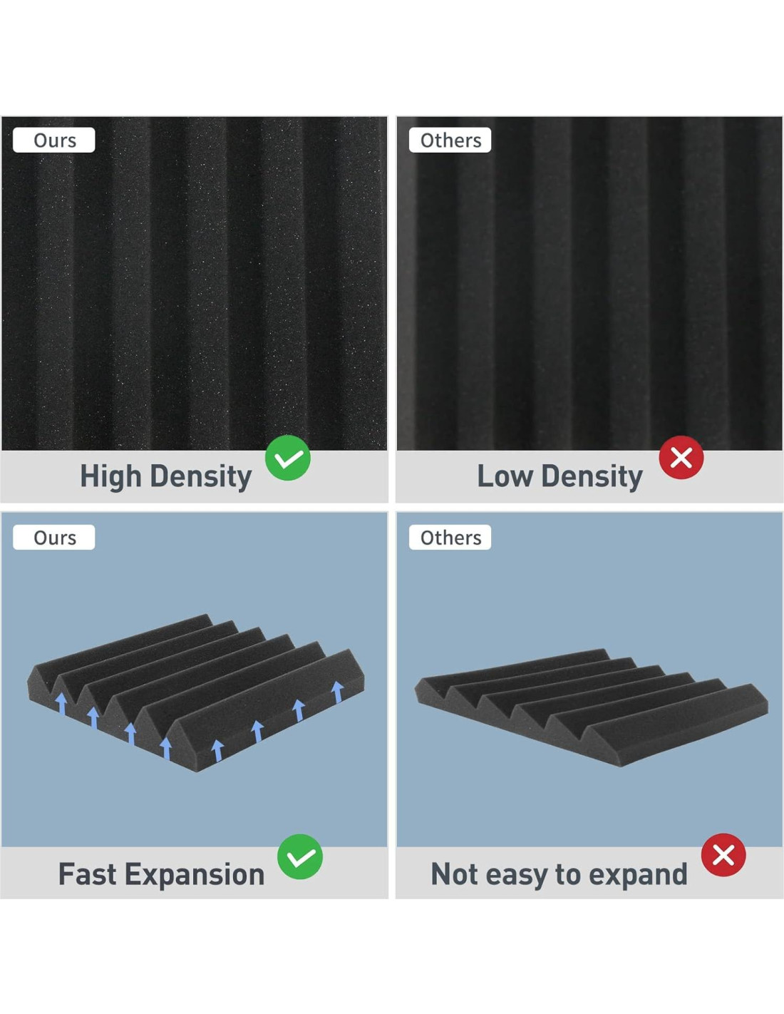 - Ligero y Fácil de Instalar: Cada panel de espuma acústica es ligero, flexible y fácil de cortar si es necesario. La instalación es rápida utilizando adhesivo en spray o cinta adhesiva de doble cara (no incluida).
