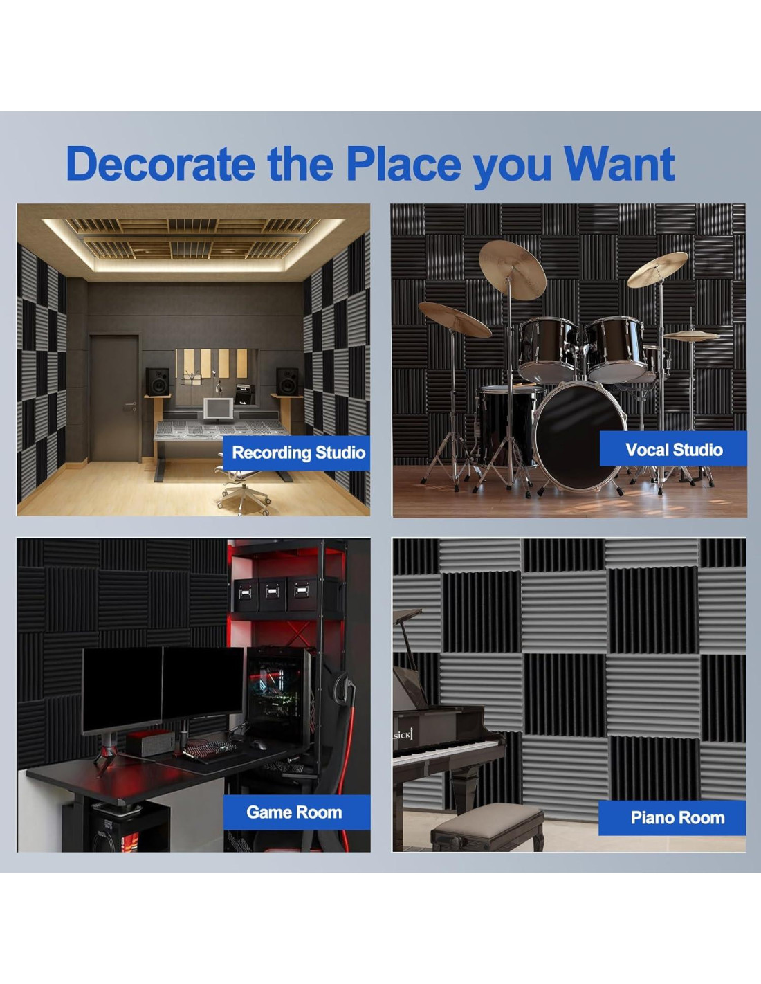 - Amplia Aplicación - Los Paneles de Espuma Acústica Earppie son adecuados para el tratamiento de sonido en las paredes de estudios u oficinas, ideales para estudios de grabación, teatros en casa, salas de control, salas de transmisión en vivo/oficinas en casa, etc. El tamaño se puede cortar de manera flexible para adaptarse a sus necesidades, y también pueden servir como decoraciones de pared.