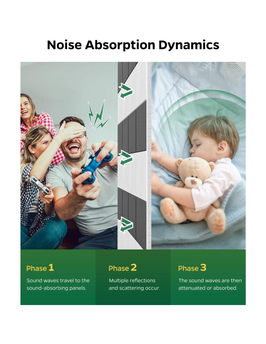 - Absorción de Sonido Efectiva: Reduce el eco y las reflexiones de sonido, mejorando la claridad de audio para una experiencia más inmersiva durante juegos, videollamadas o noches de cine para crear un espacio más silencioso. Nuestros paneles de espuma acústica también proporcionan un sutil aislamiento acústico.